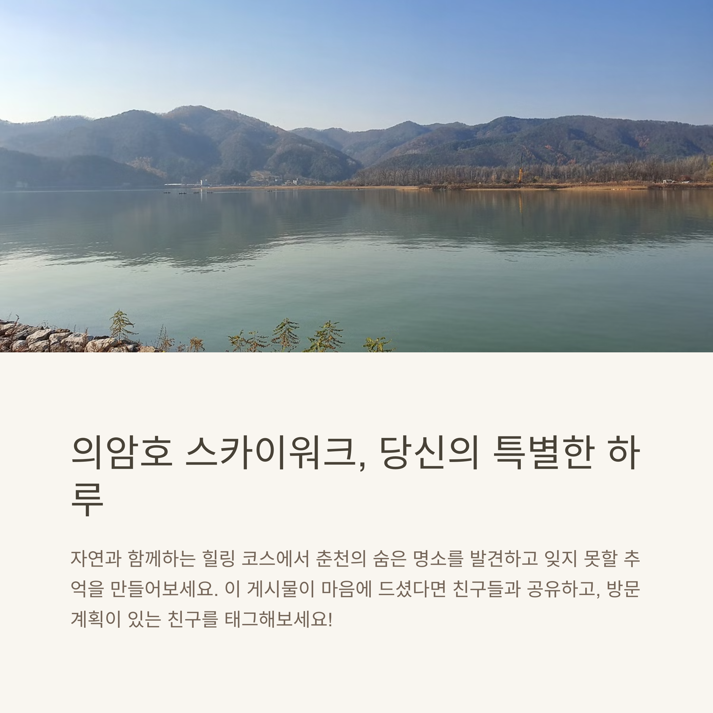 춘천 의암호 스카이워크를 다녀오신 분들의 후기가 궁금합니다! 여러분만의 추천 코스나 방문 팁, 사진 명소 등을 댓글로 자유롭게 남겨주세요. 함께 나누면 여행이 더 즐거워집니다.