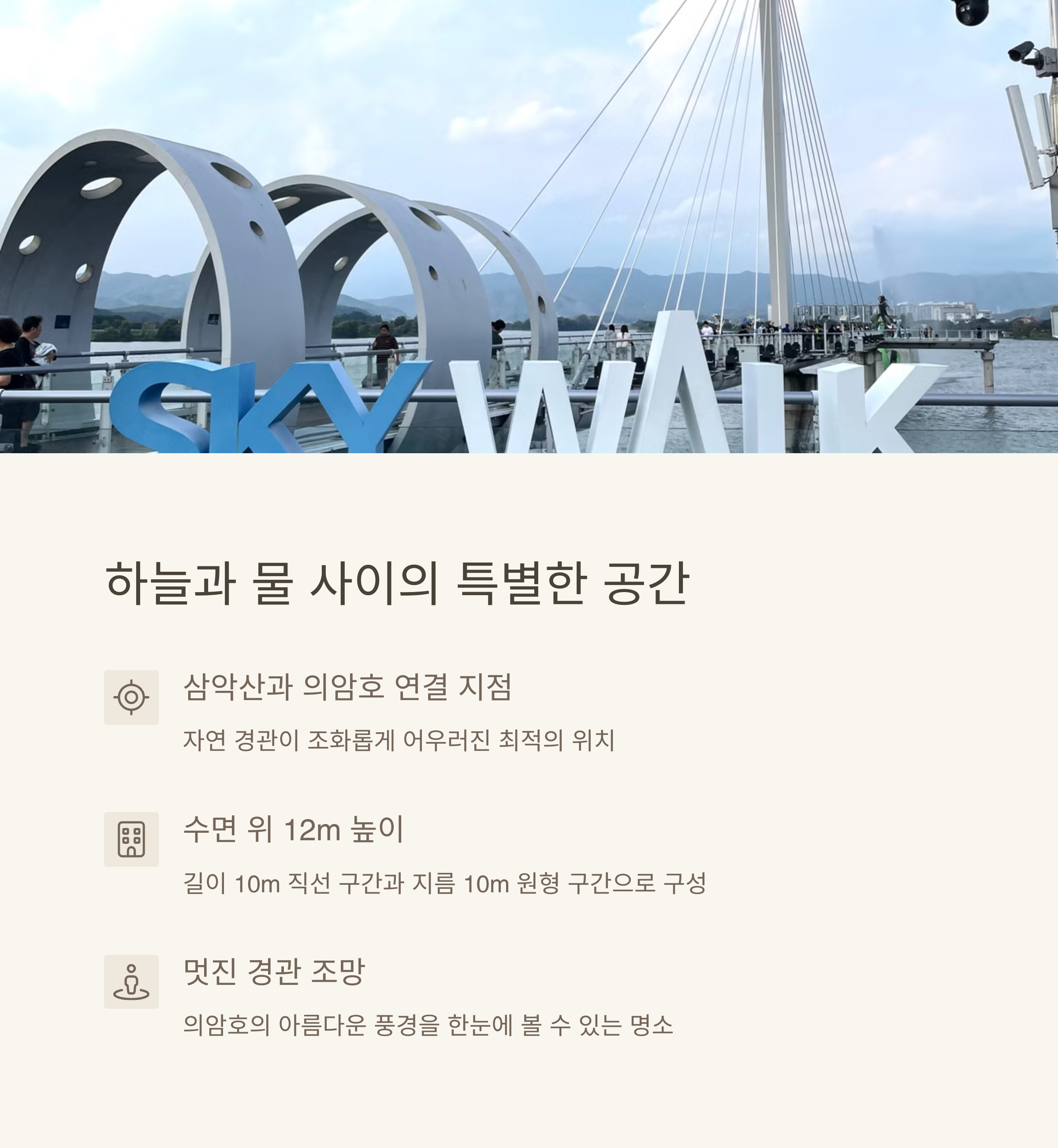 춘천 의암호 스카이워크는 자연과 도시의 경계에서 특별한 풍경을 마주할 수 있는 매력적인 공간입니다. 수면 위 12m 높이에 설치된 이 산책로는 직선과 원형 구조로 설계되어, 마치 호수 위를 걷는 듯한 색다른 감각을 경험하게 해줍니다. 투명 강화유리로 제작된 바닥 덕분에 발 아래 펼쳐진 물결을 생생히 볼 수 있어 많은 방문객들에게 특별한 인상을 남깁니다.