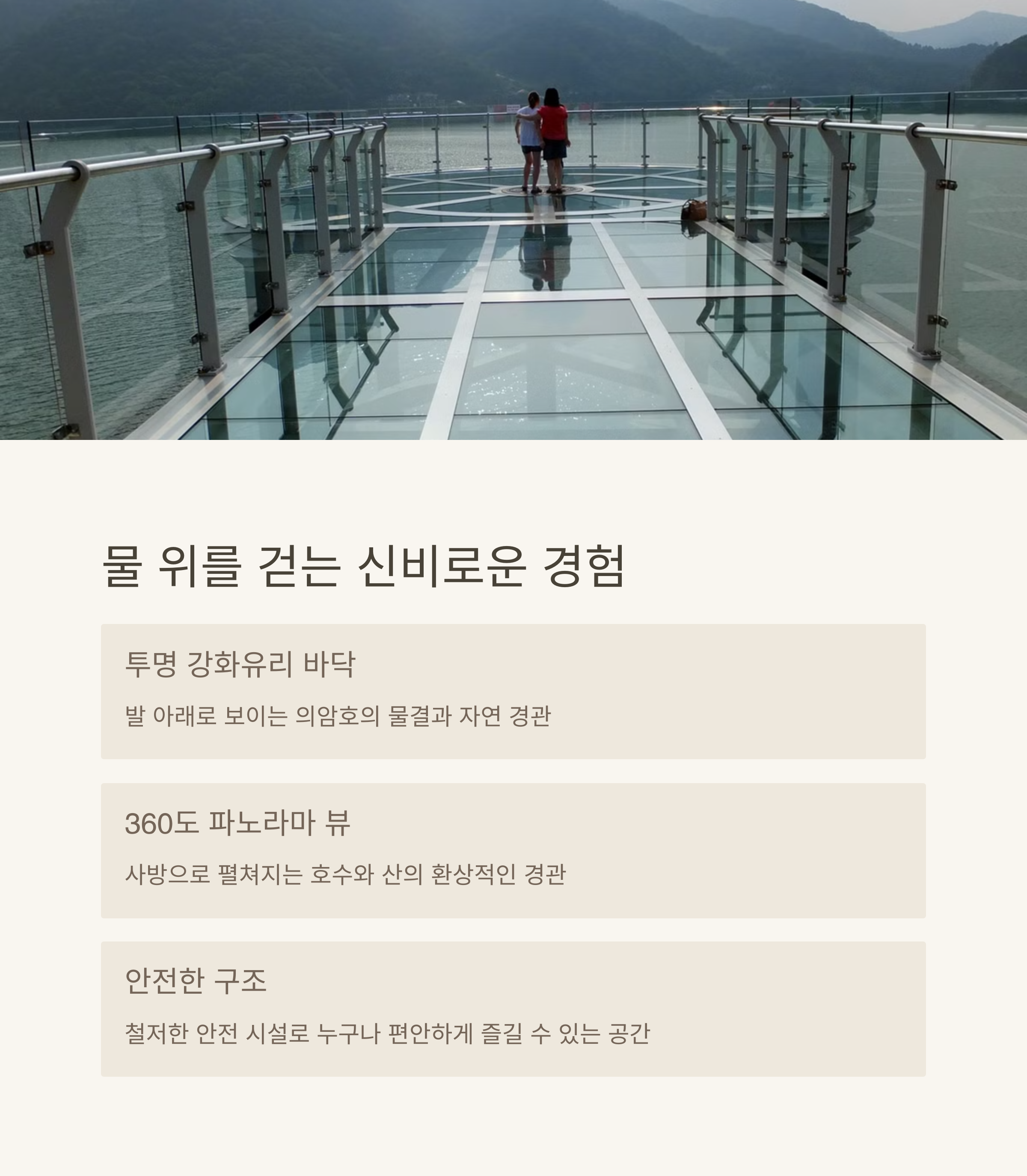 | 호수 위 강화유리 산책로, 사진 명소로 인기 | 송암스포츠타운 주차 후 도보 15분 거리 | 3~11월 무료 개방, 누구나 이용 가능 |