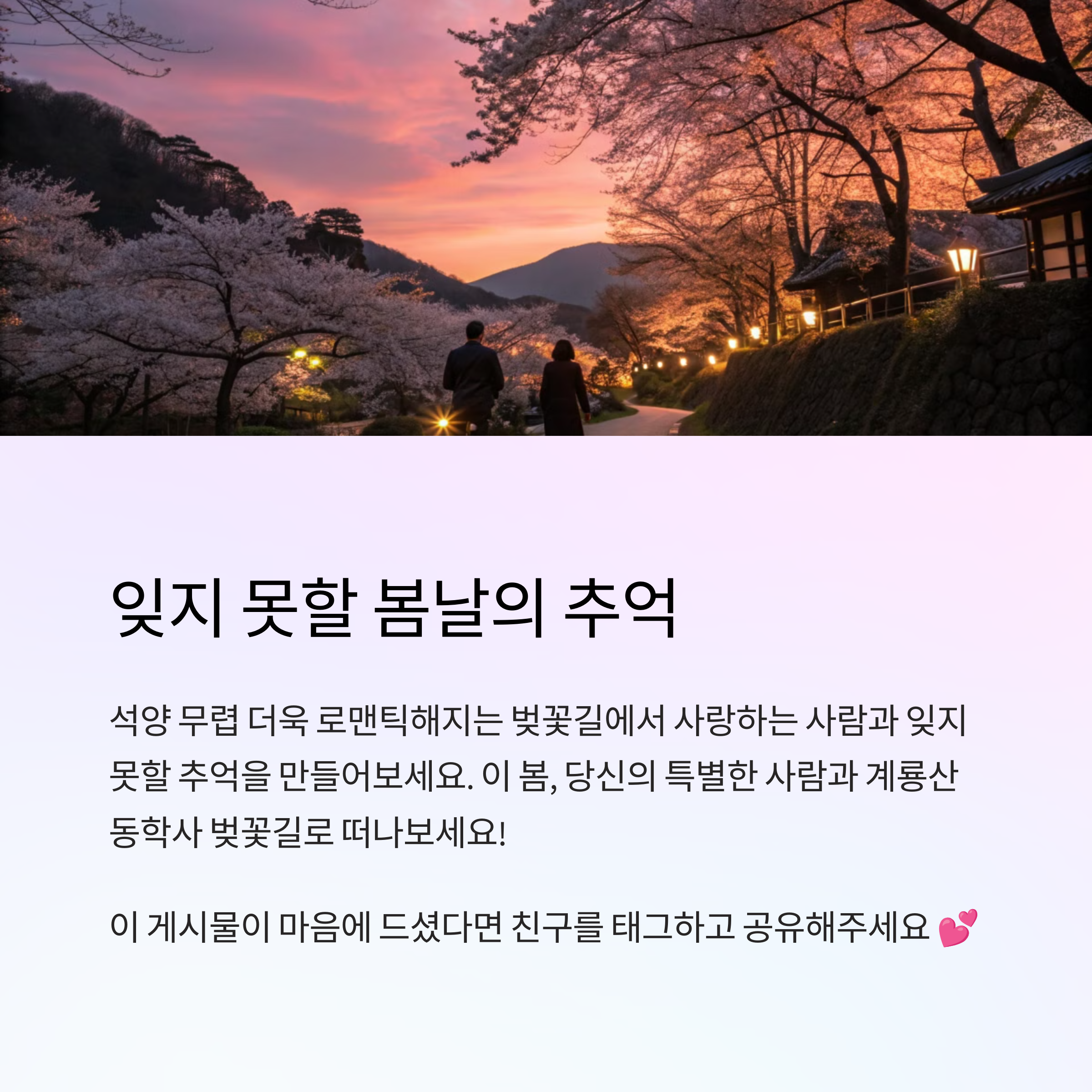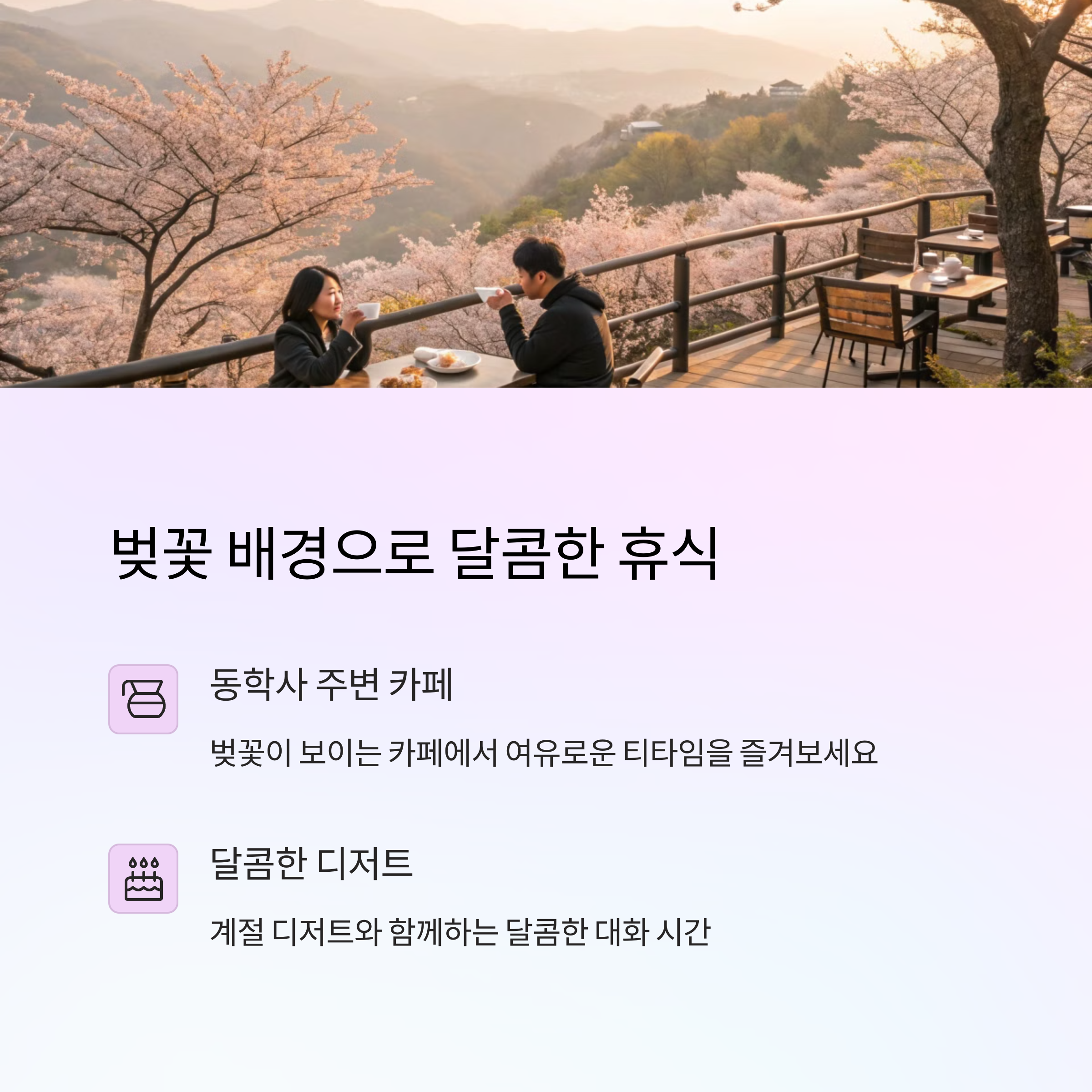 | 추천 코스 | 동학사 벚꽃길 → 동학사 방문 → 한식 식사 & 카페 투어 |