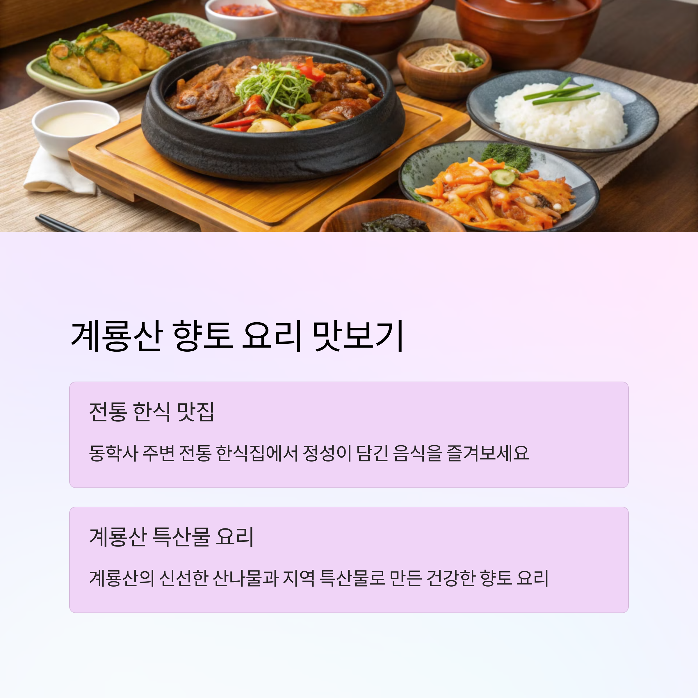 | 추천 코스 | 벚꽃길 산책 → 동학사 방문 → 전통 한식 식사 & 카페 투어 |