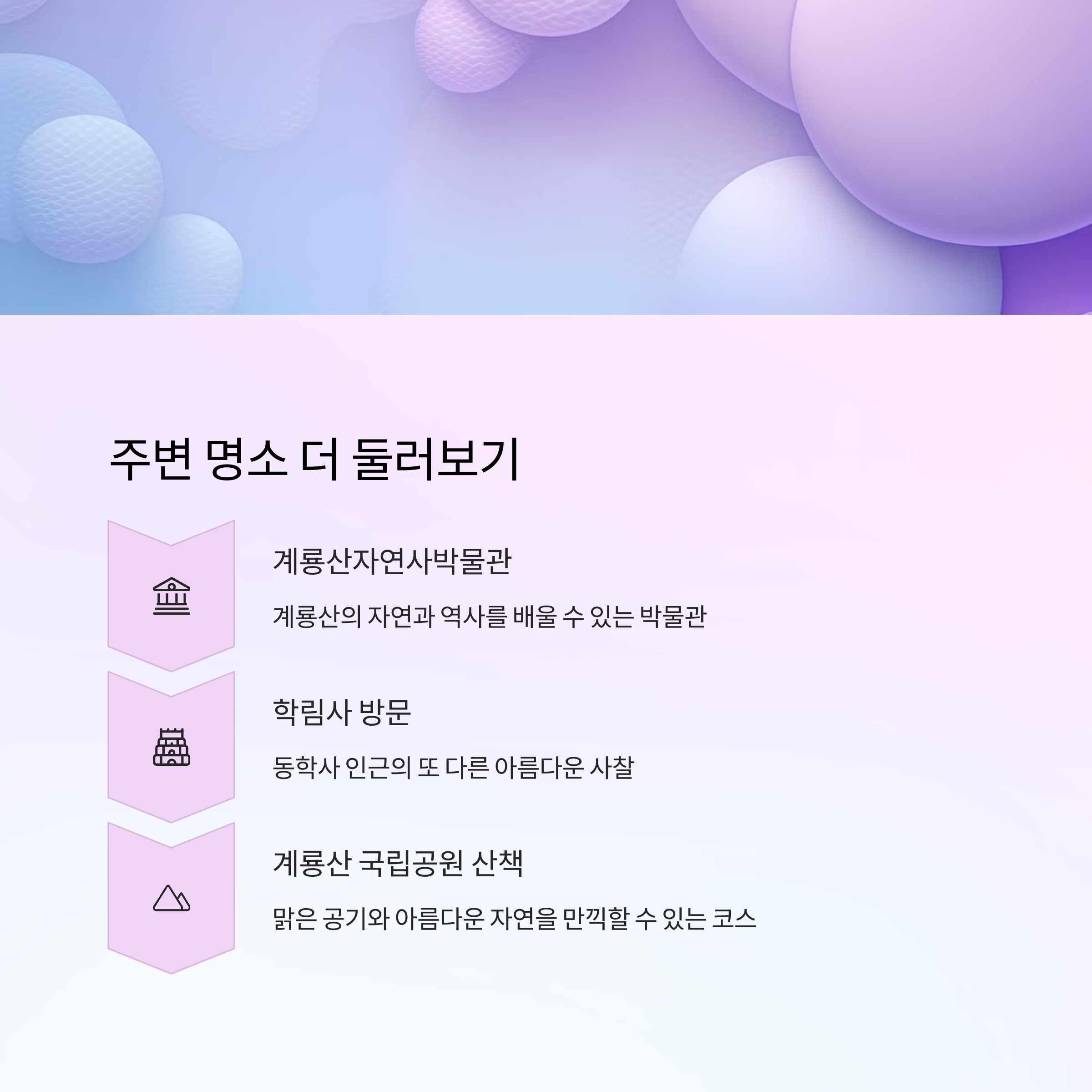 동학사에서 가까운 자연사박물관, 학림사는 역사와 자연을 함께 느낄 수 있는 명소입니다. 또한, 전통 한식 맛집과 감성적인 카페들도 많아 벚꽃길 산책 후 방문하기 좋습니다.