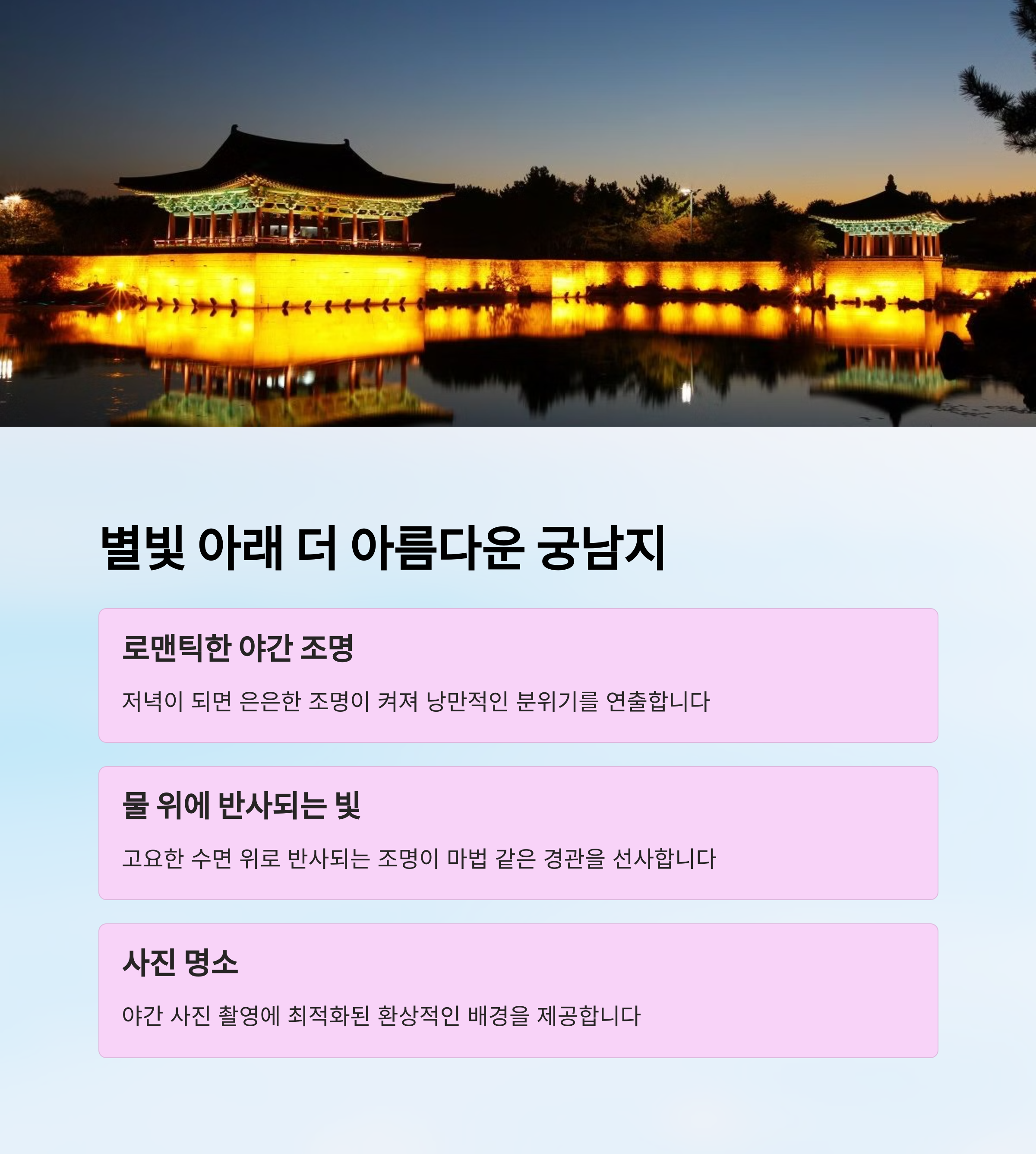 궁남지는 특히 야간 산책 코스로도 유명합니다. 연못 주위를 따라 켜지는 조명은 밤의 궁남지를 더욱 신비롭고 감성적인 장소로 만들어주며, 여름철에는 빛나는 연꽃들과 함께 야경을 즐길 수 있는 특별한 시간이 됩니다. 계절별로 꽃과 나무들이 변화를 보여주기 때문에 사계절 언제 방문해도 전혀 다른 매력을 느낄 수 있으며, 사진 촬영지로도 많은 사람들에게 사랑받고 있습니다.