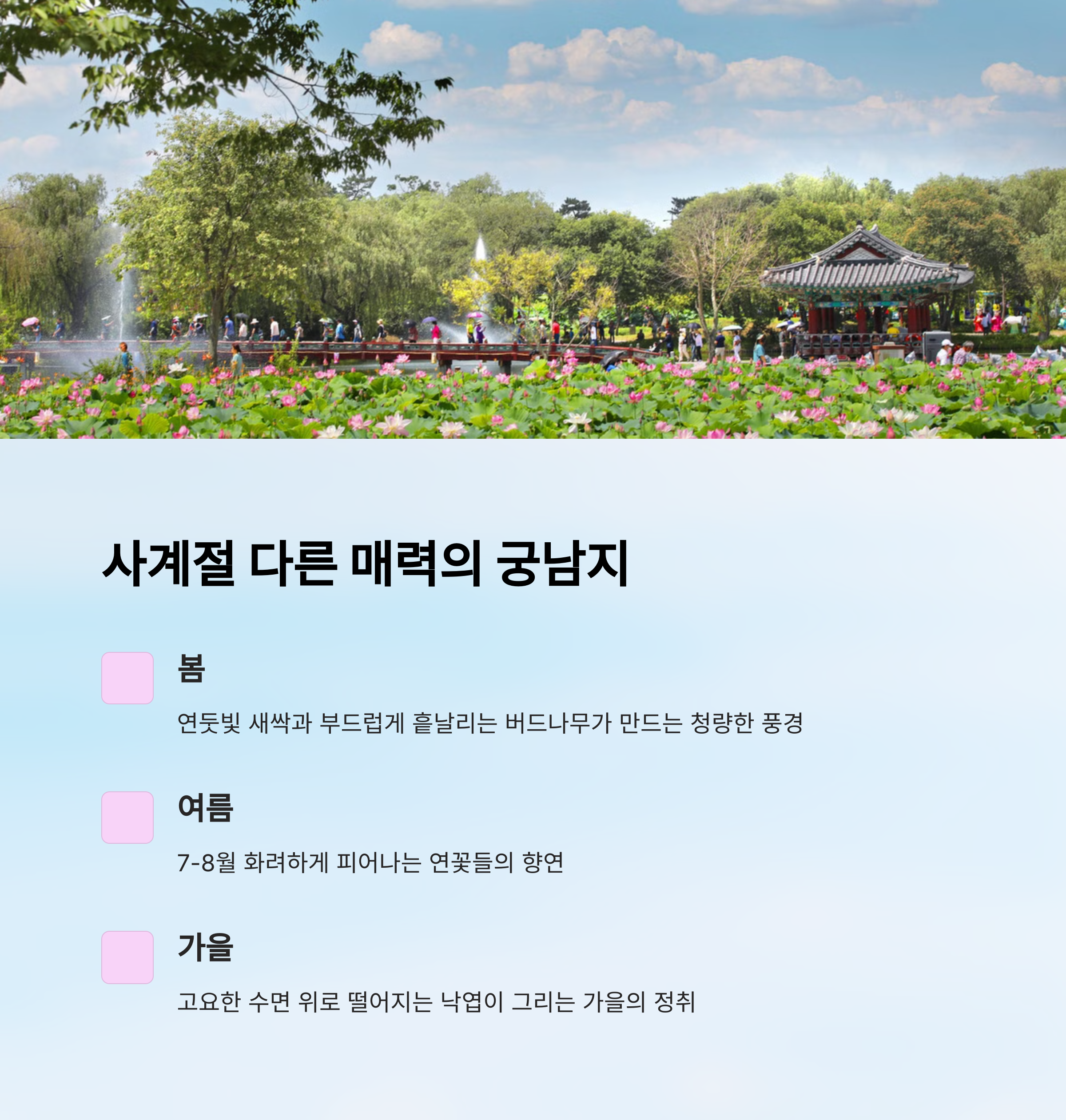 | 백제 시대 인공 연못, 한국관광 100선 | 1시간 코스, 24시간 무료 개방 | 7~8월 만개, 사진 명소로 인기 |