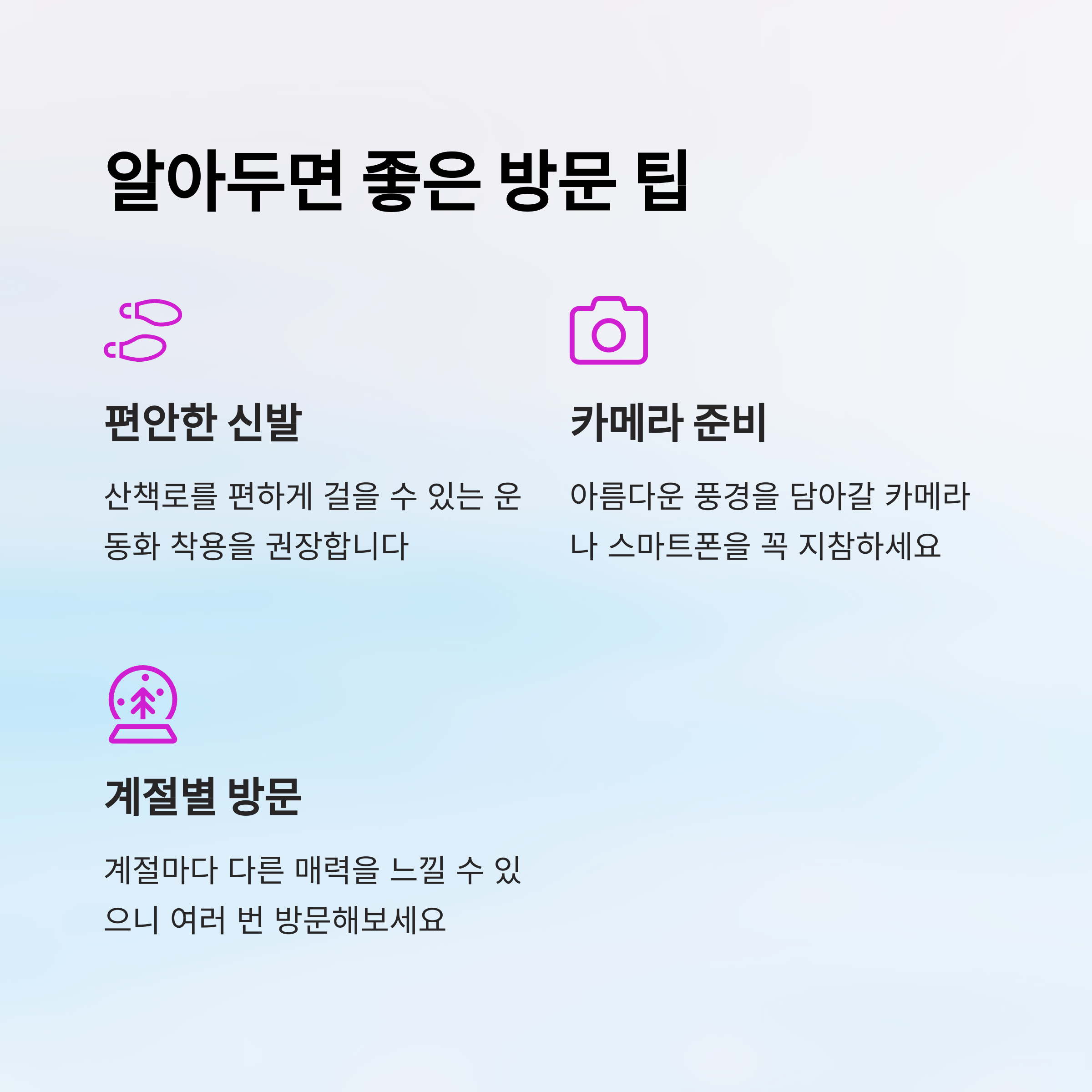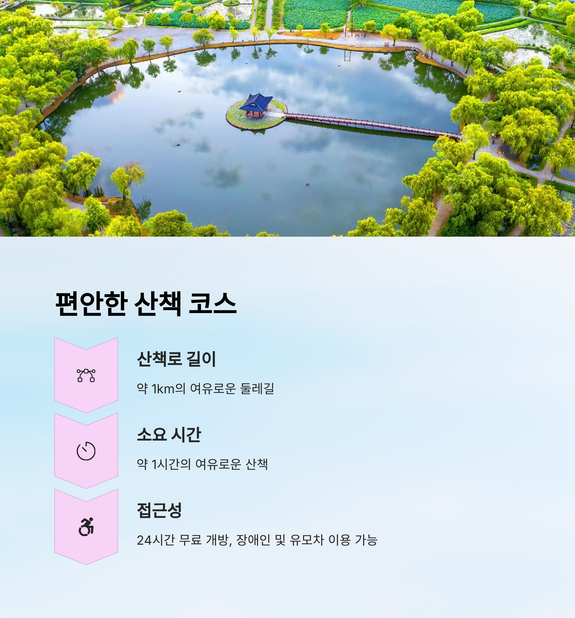 | 산책코스 정보 | 약 1시간, 24시간 개방, 입장료 무료 |
