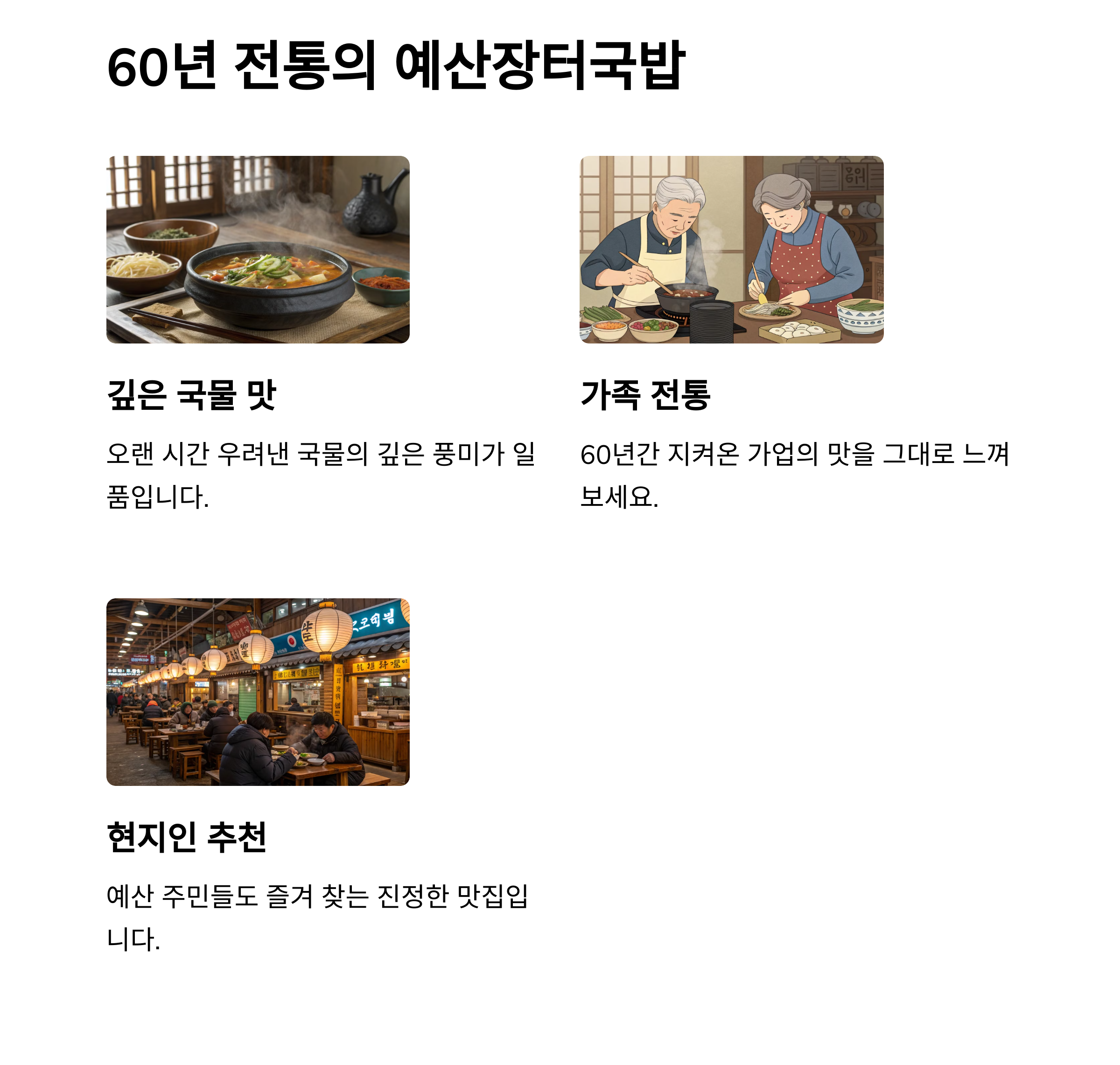 | 예산 국밥거리 | 다양한 국밥 맛집 밀집 | 깊고 진한 국물 맛 |