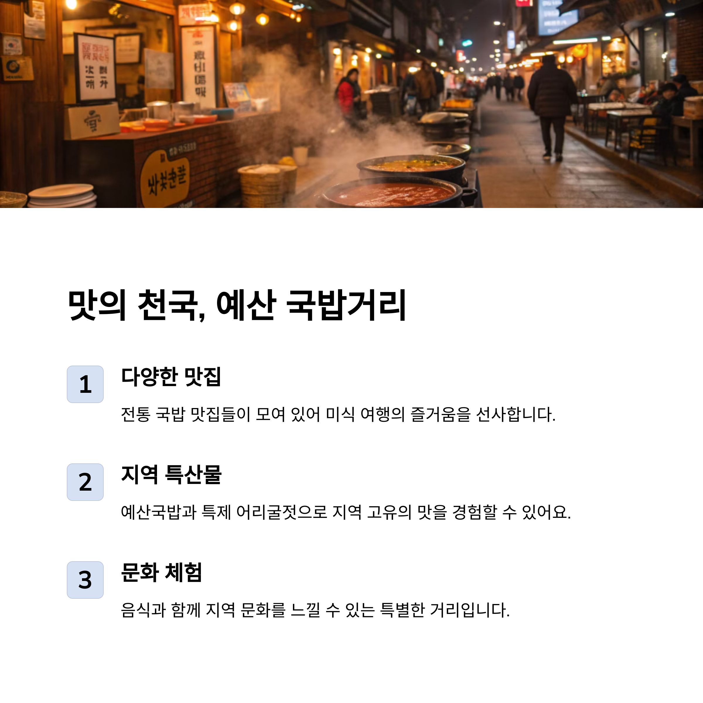 | 예산 국밥거리 | 다양한 국밥 맛집 밀집 | 깊고 진한 국물 맛 |