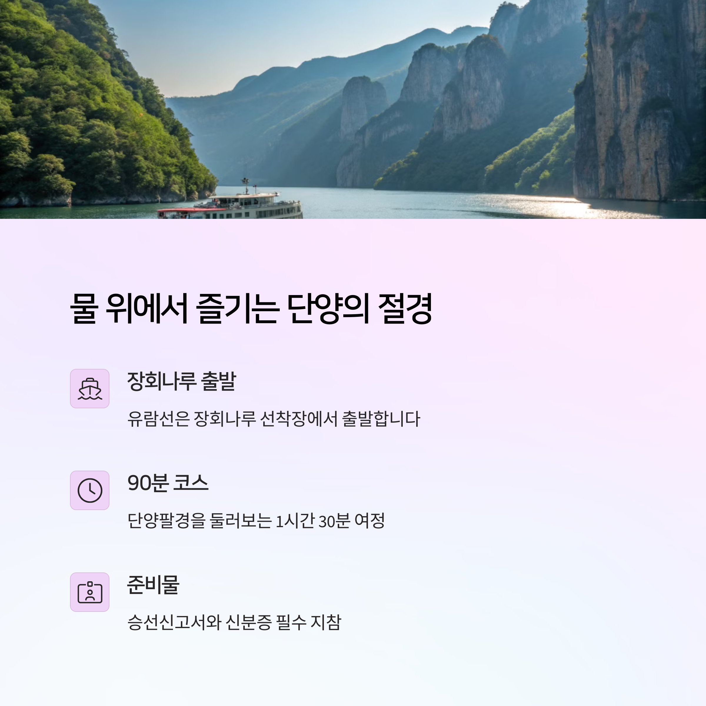 | 충주호 유람선 | 제비봉, 구담봉 등 절경을 유람선에서 감상 |