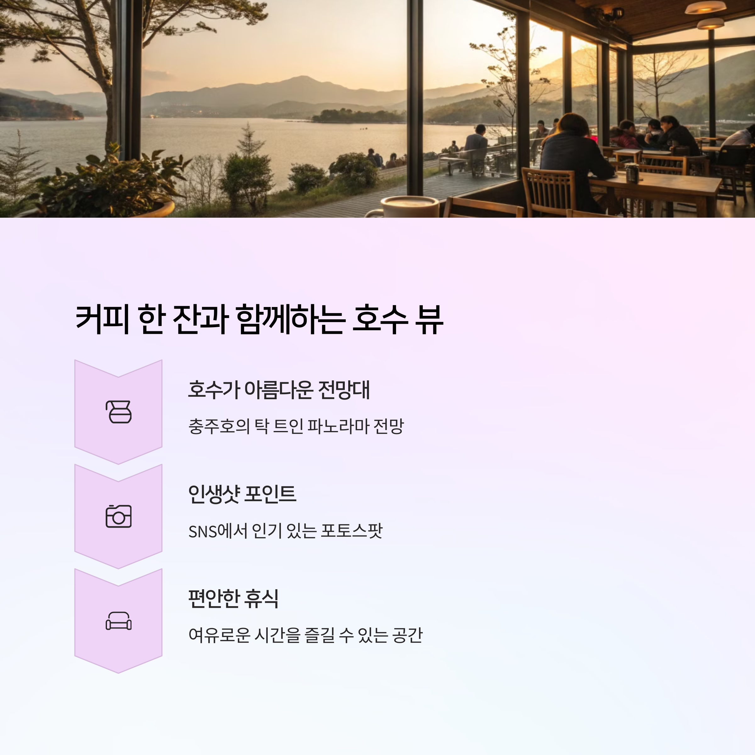 여행의 마무리는 충주호가 한눈에 보이는 감성 뷰카페에서의 한적한 시간입니다. '호수가 아름다운 전망대'에서는 창 너머로 펼쳐지는 호수를 배경으로 여유로운 시간을 보낼 수 있으며, '게으른 악어'에서는 직접 라면을 끓여먹는 독특한 콘셉트로 색다른 캠핑 분위기를 연출합니다. 여행 중간중간 만날 수 있는 사과 막국수, 단월샌드, 뽕잎밥 같은 지역 맛집도 빼놓을 수 없는 묘미입니다. 경치와 맛, 체험이 어우러진 단양+충주호 여행은 일상에 지친 몸과 마음을 재충전해 줄 완벽한 코스입니다.