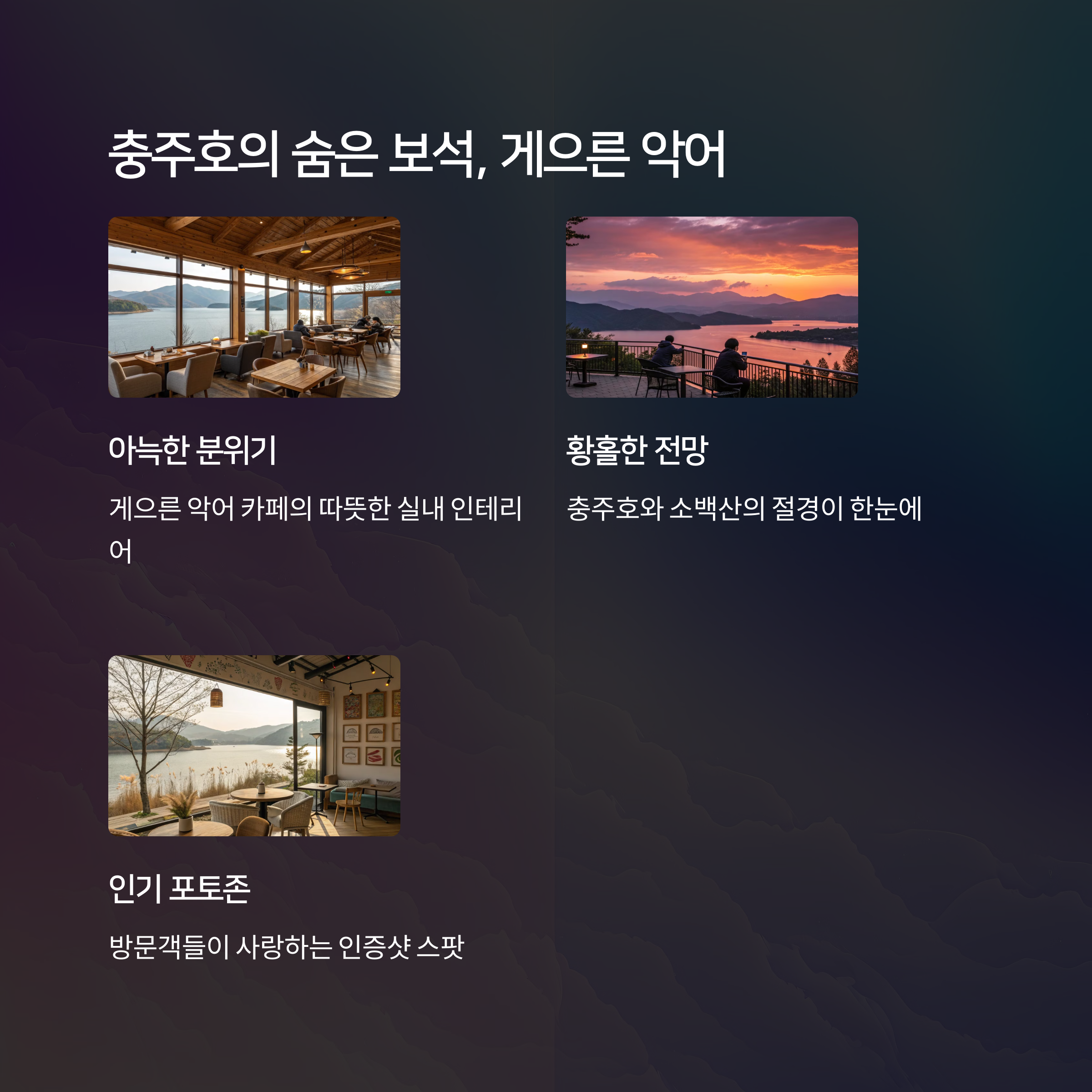 여행의 마무리는 충주호가 한눈에 보이는 감성 뷰카페에서의 한적한 시간입니다. '호수가 아름다운 전망대'에서는 창 너머로 펼쳐지는 호수를 배경으로 여유로운 시간을 보낼 수 있으며, '게으른 악어'에서는 직접 라면을 끓여먹는 독특한 콘셉트로 색다른 캠핑 분위기를 연출합니다. 여행 중간중간 만날 수 있는 사과 막국수, 단월샌드, 뽕잎밥 같은 지역 맛집도 빼놓을 수 없는 묘미입니다. 경치와 맛, 체험이 어우러진 단양+충주호 여행은 일상에 지친 몸과 마음을 재충전해 줄 완벽한 코스입니다.