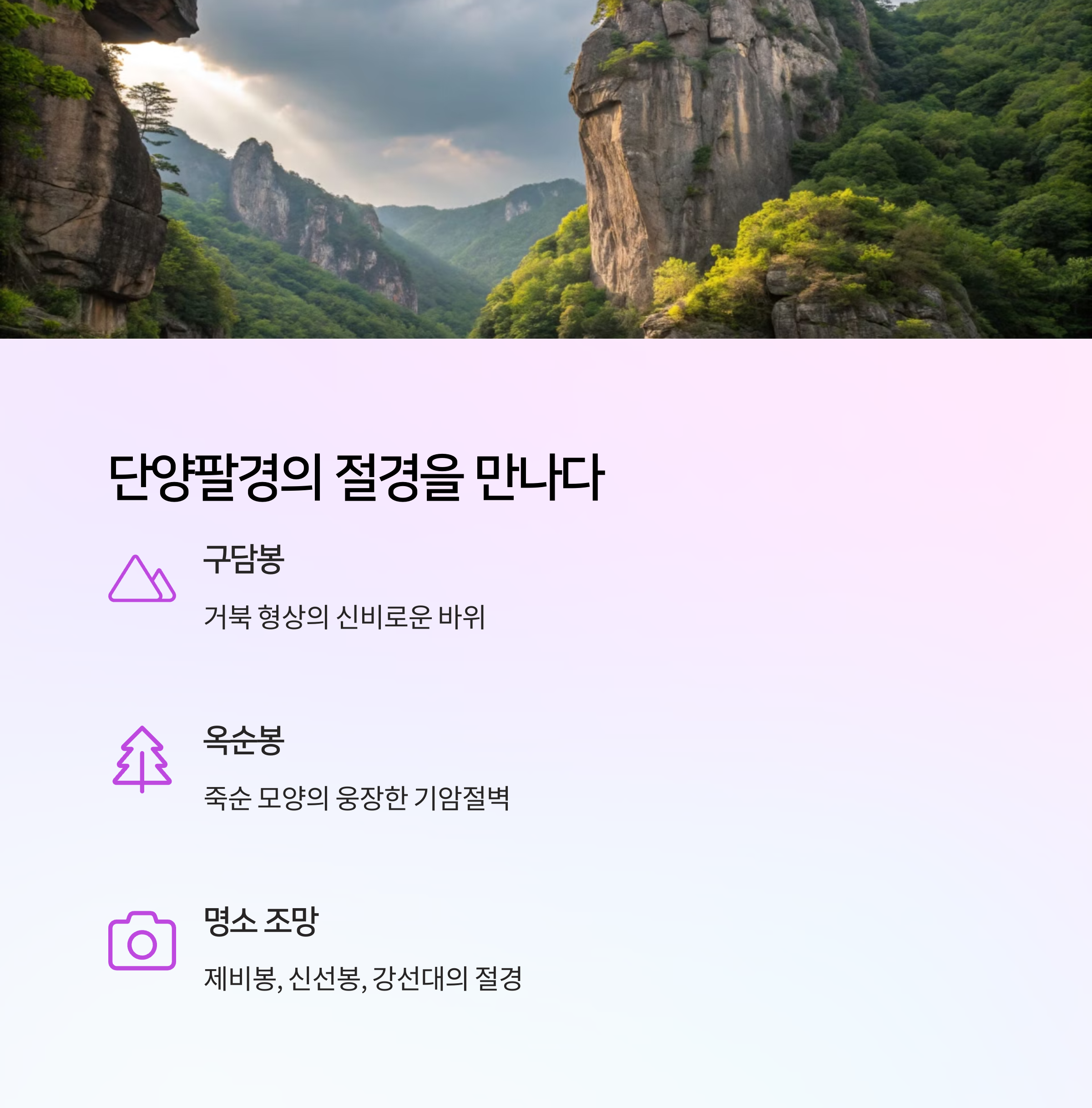 충북 단양과 충주호를 잇는 여행 코스는 자연의 아름다움과 이색적인 체험이 조화를 이루는 매력적인 일정입니다. 충주호 유람선에서는 고요한 호수 위를 미끄러지듯 이동하며 단양팔경의 비경을 감상할 수 있고, 그 중에서도 구담봉과 옥순봉은 절경으로 손꼽히는 명소입니다. 제비봉과 강선대의 기암절벽은 보는 이로 하여금 감탄을 자아내며, 유람선 탑승 시 신분증과 승선신고서가 필요하니 꼭 준비하세요. 자연 경관을 가까이서 체험할 수 있어 여행의 시작을 장엄하게 열어주는 구간입니다.