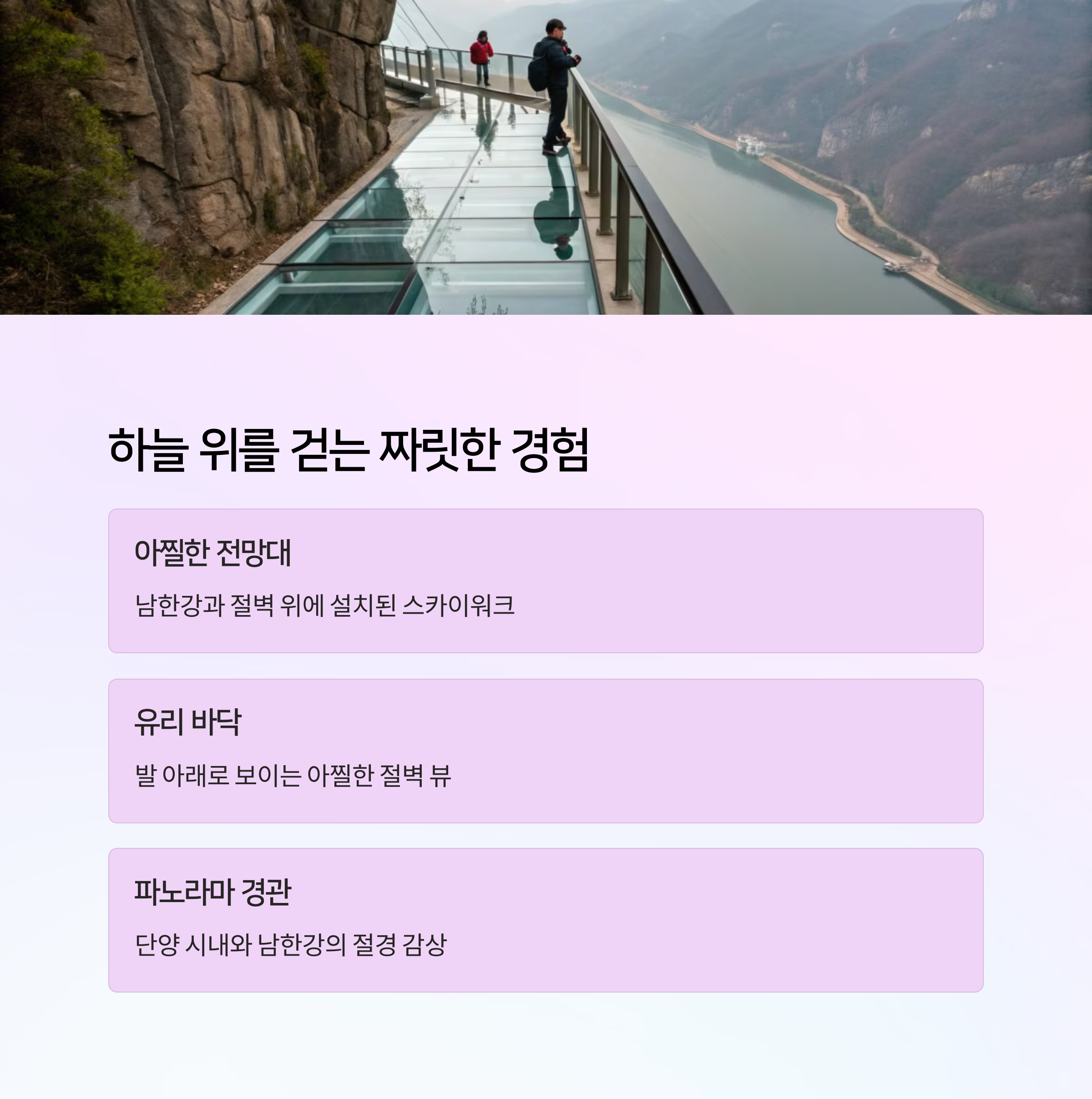 단양의 대표 명소 중 하나인 만천하스카이워크는 그 이름만큼이나 탁 트인 전경을 자랑합니다. U자형 유리 데크에서 남한강을 내려다보며 마치 하늘을 걷는 듯한 경험을 할 수 있고, 짚와이어를 통해 강 위를 가로지르는 스릴도 느낄 수 있습니다. 알파인코스터는 숲속을 달리며 바람을 가르며 짜릿한 속도를 즐기기에 제격이며, 모노레일은 편안하게 단양의 자연을 감상할 수 있는 힐링 코스입니다. 다양한 연령층이 함께 즐길 수 있는 체험형 여행지로 추천됩니다.