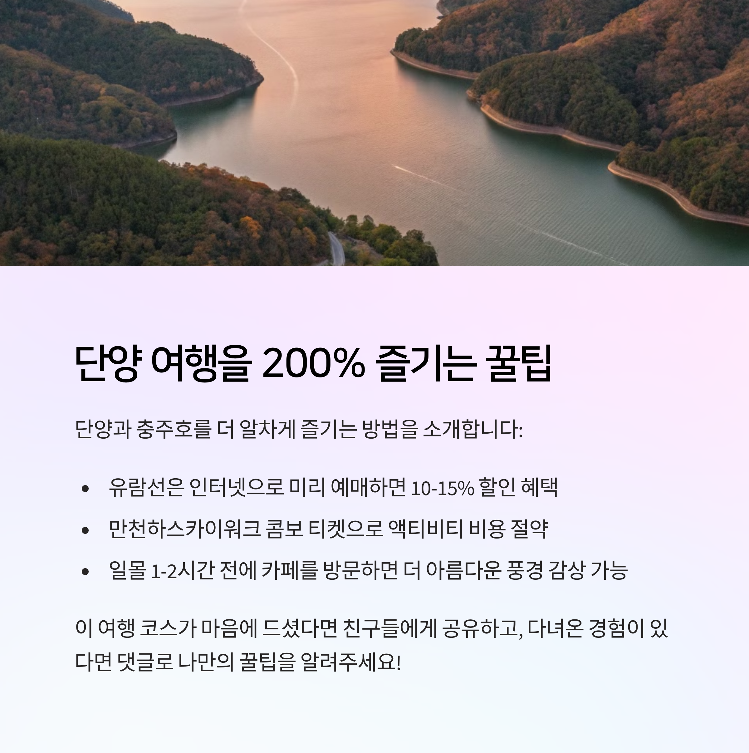충북 단양과 충주호를 잇는 여행 코스는 단순한 관광지를 넘어서 힐링과 체험, 미식이 공존하는 특별한 여정입니다. 도심을 벗어나 여유롭고 풍성한 시간을 보내고 싶은 분들에게 적극 추천드리는 코스로, 자연 속에서 느낄 수 있는 감동과 지역 특색이 담긴 맛집까지 모두 갖추고 있습니다. 이번 여행이 여러분의 삶에 소중한 기억으로 남길 바랍니다.