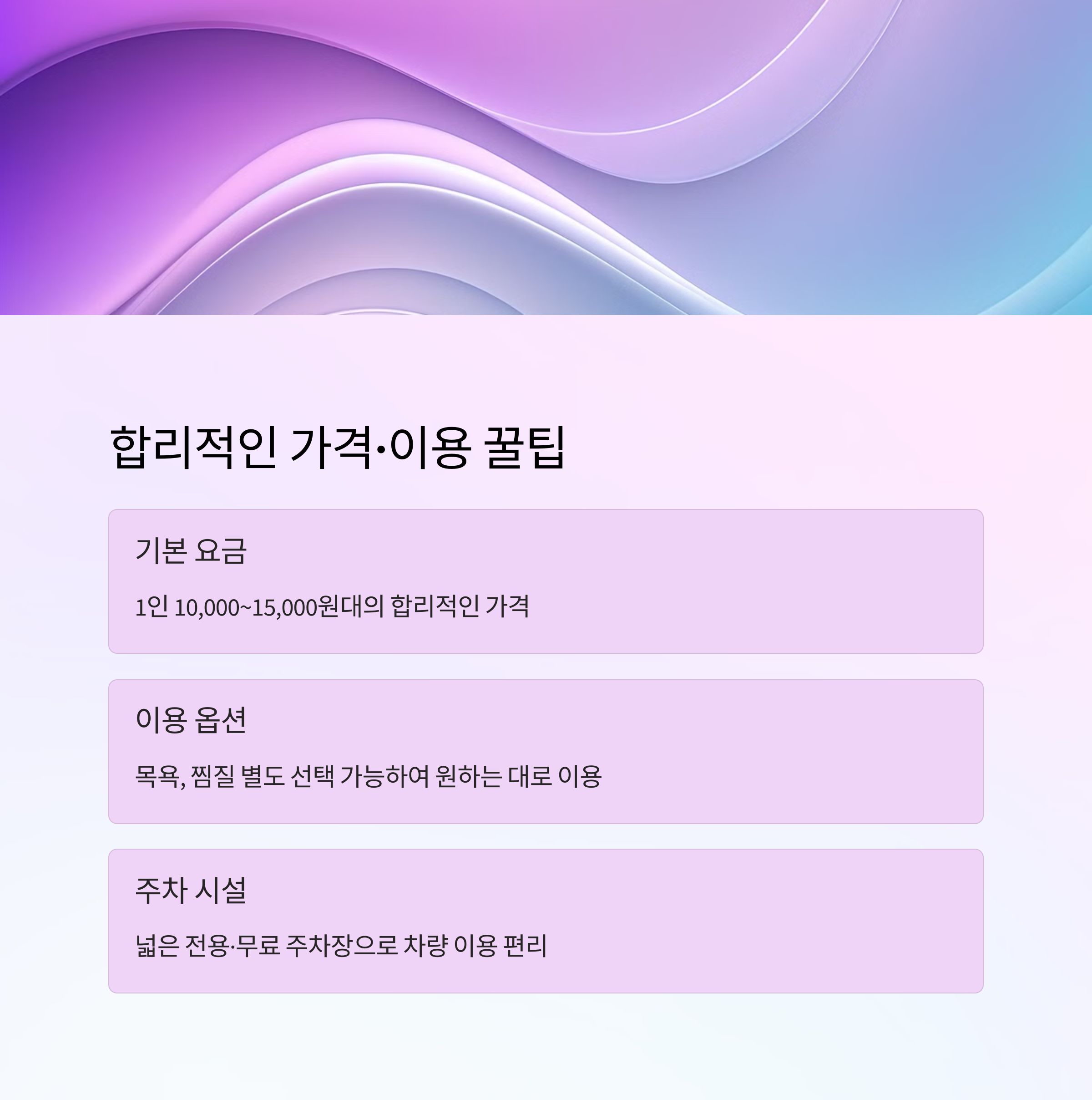 이용 팁 입장료 1인 약 10,000~15,000원 / 사우나, 찜질방, 식당, 휴게실 완비 / 넉넉한 주차 공간