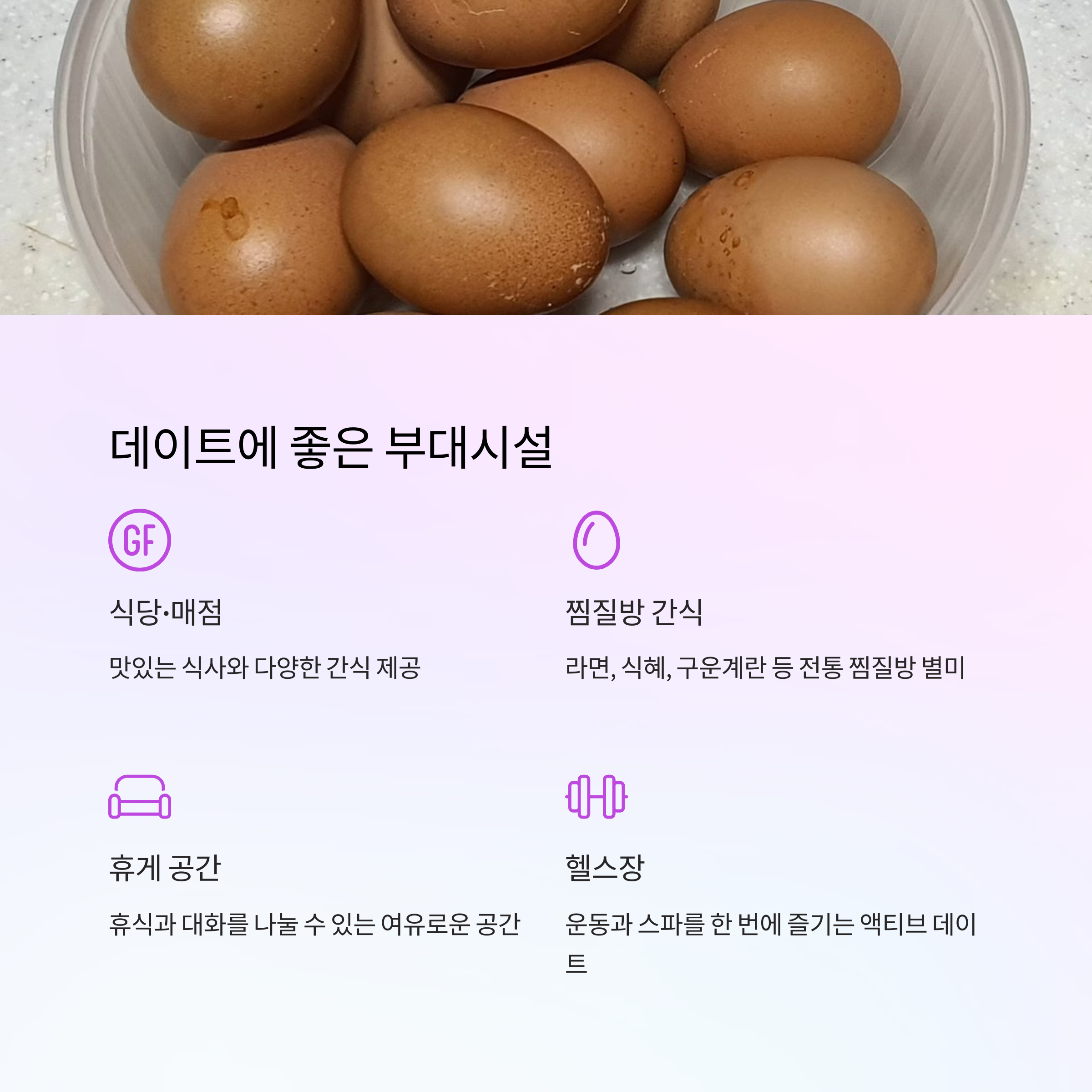 추운 날씨에도, 비 오는 날에도 완벽하게 즐길 수 있는 실내 데이트 장소. 충북 청주의 온천 찜질방은 피로를 녹이고, 대화를 나누며 함께 쉬기에 가장 좋은 공간입니다. 특히 커플이 나란히 앉아 찜질하거나, TV를 보며 쉬는 동안 서로의 하루를 돌아보고 가까워질 수 있는 특별한 시간이 될 거예요. 겨울철 실내 데이트 코스로 강력 추천드립니다.