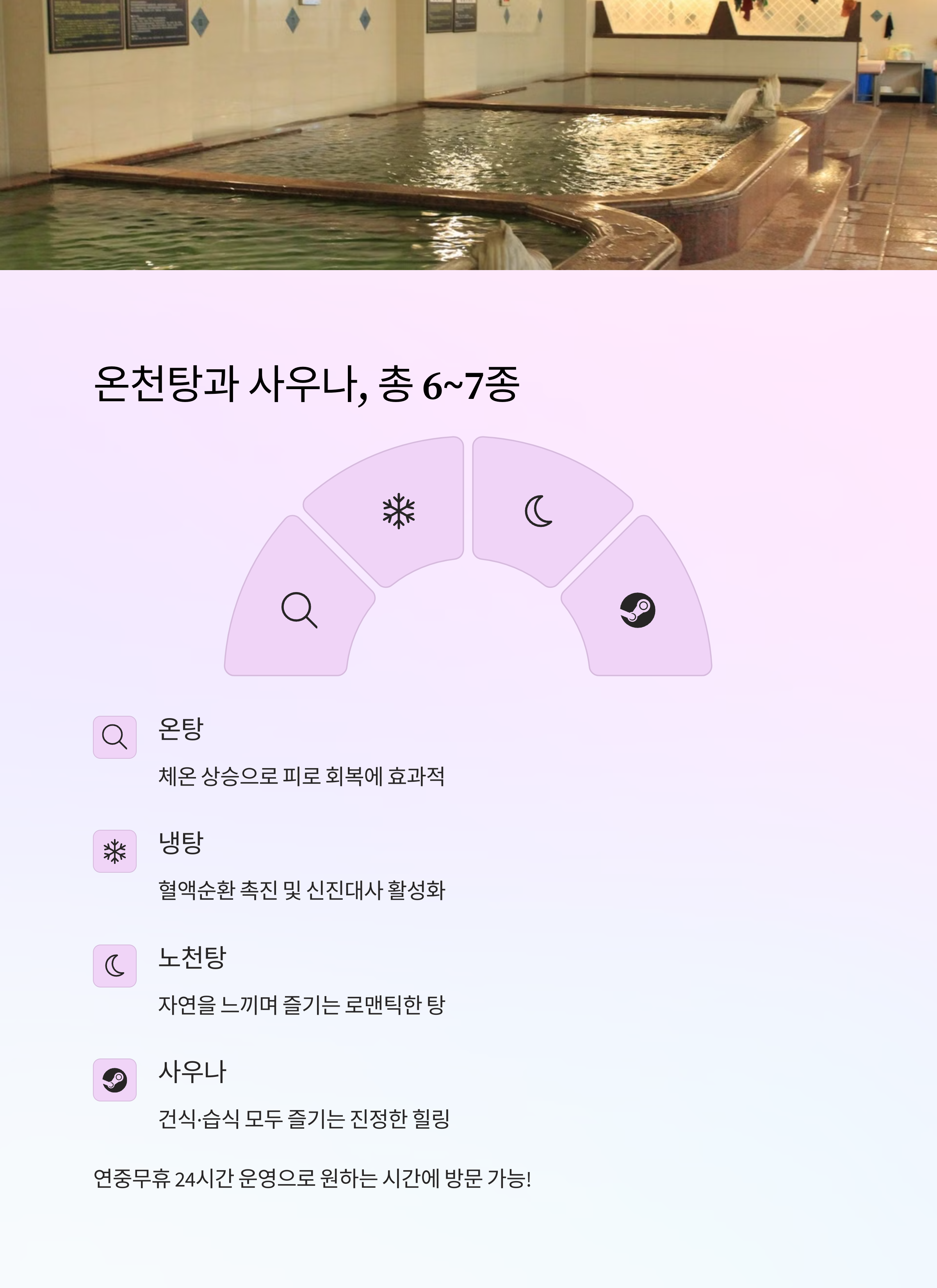 알칼리성 온천수, 4종 찜질방, TV 좌석 24시간 운영, 조용한 휴식형 공간 식당, 휴게실, 깨끗한 시설과 넓은 주차장