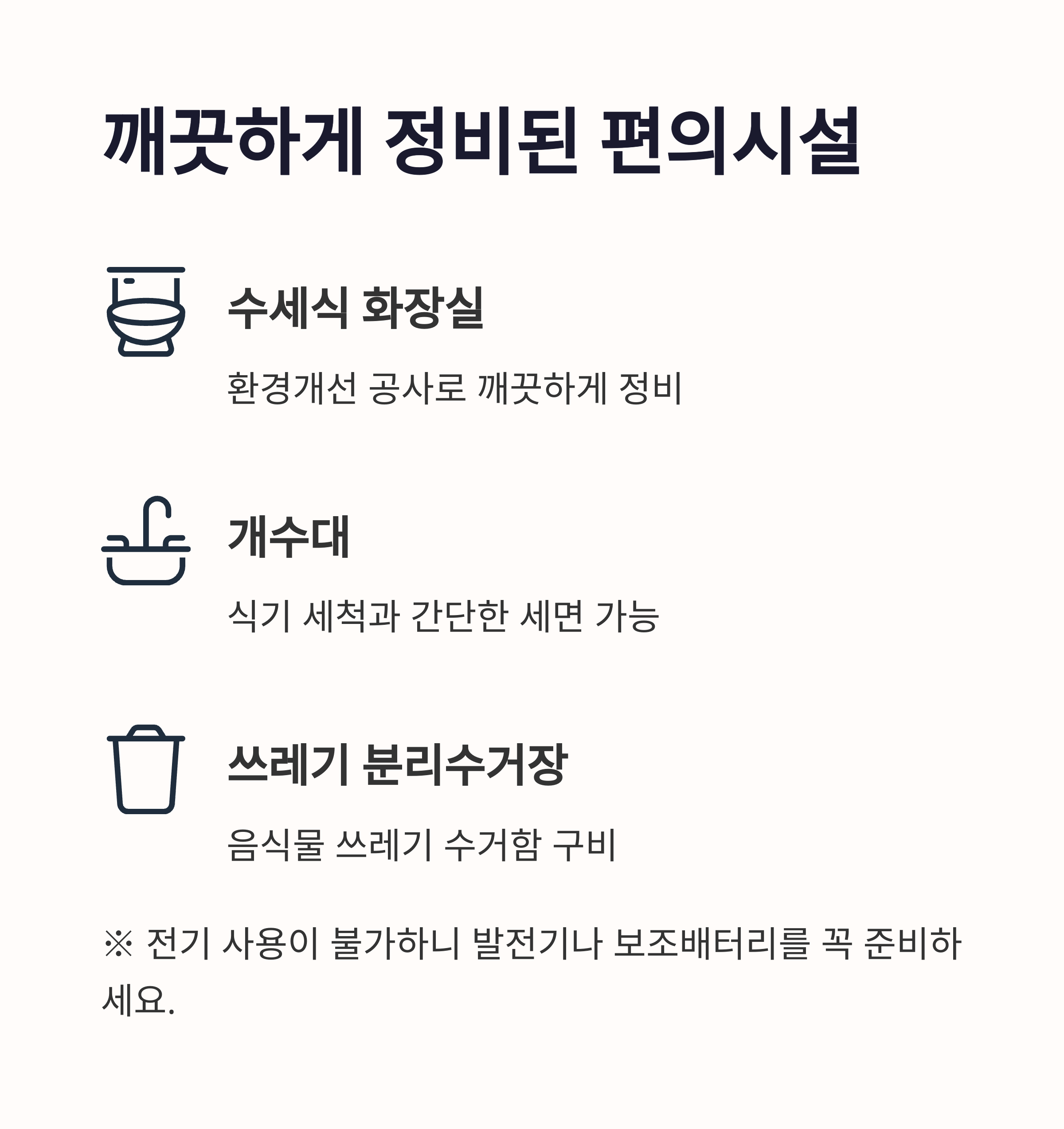 이용 안내 무료 차박 가능 / 전기 없음 / 수세식 화장실·개수대 있음 / 샤워장 없음