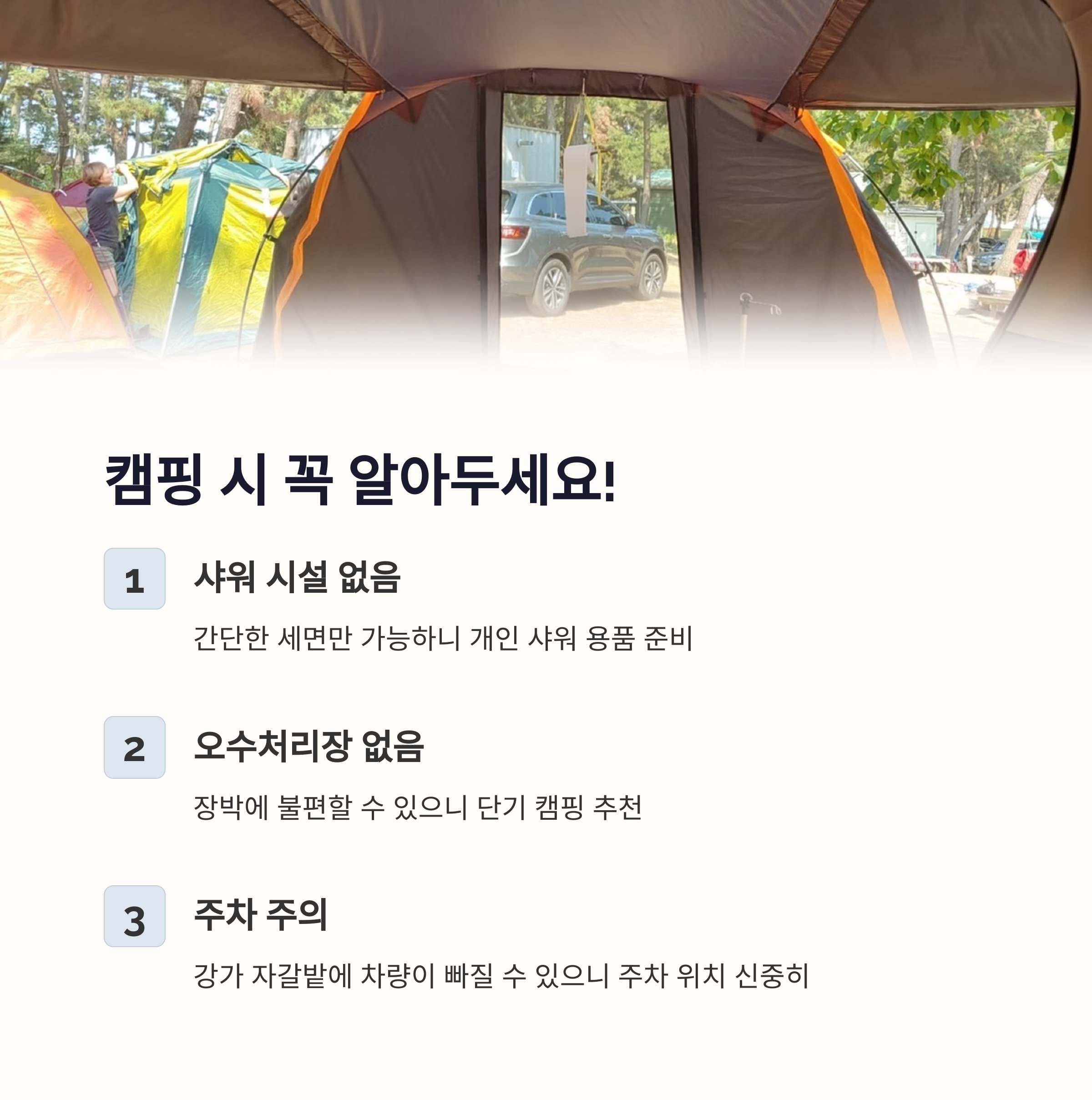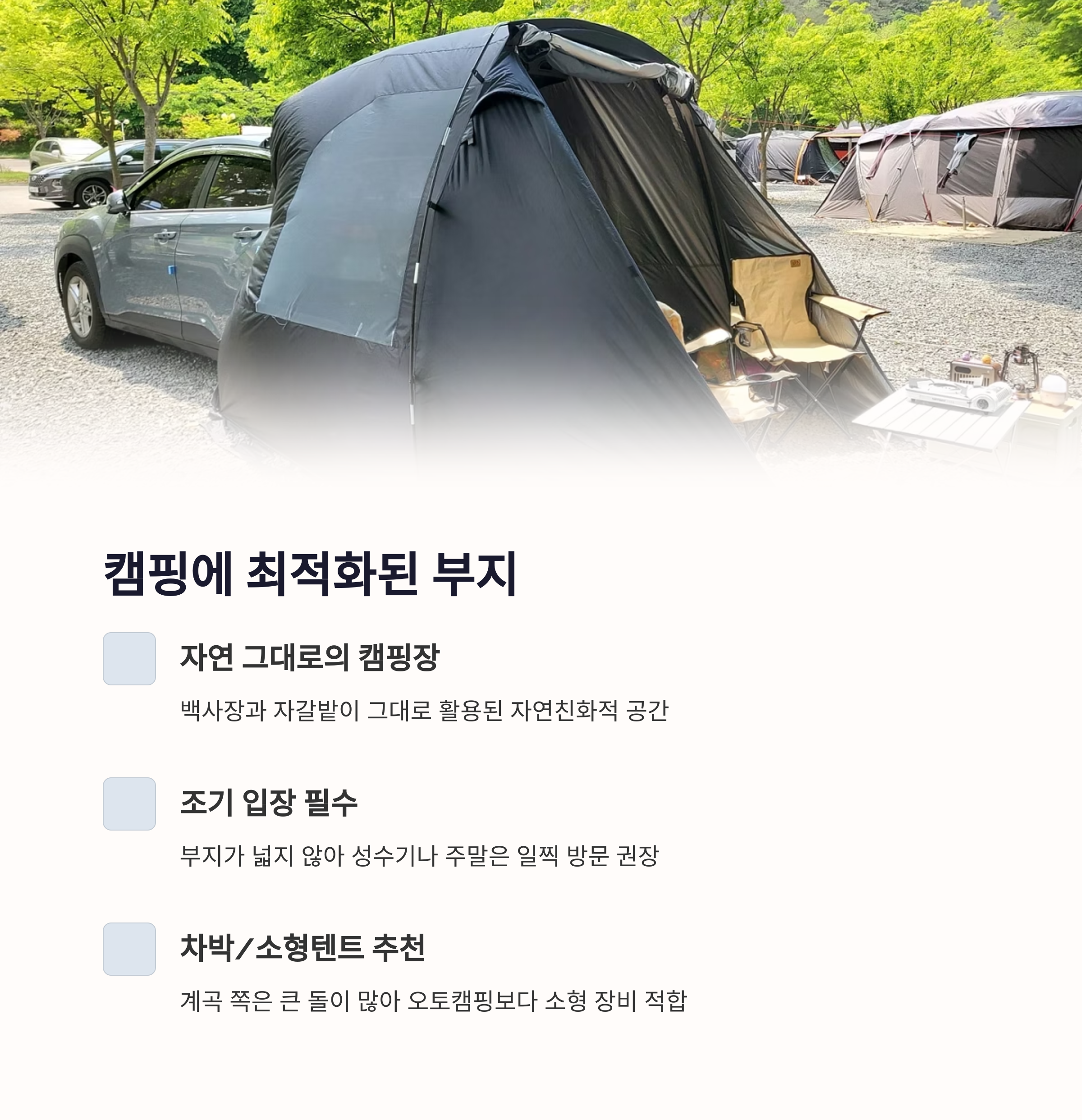 전기 없음, 샤워 불가, 장박 부적합 | 미니멀 차박, 소형 텐트에 적합한 공간 | 성수기엔 자리 경쟁, 평일 방문 추천 |