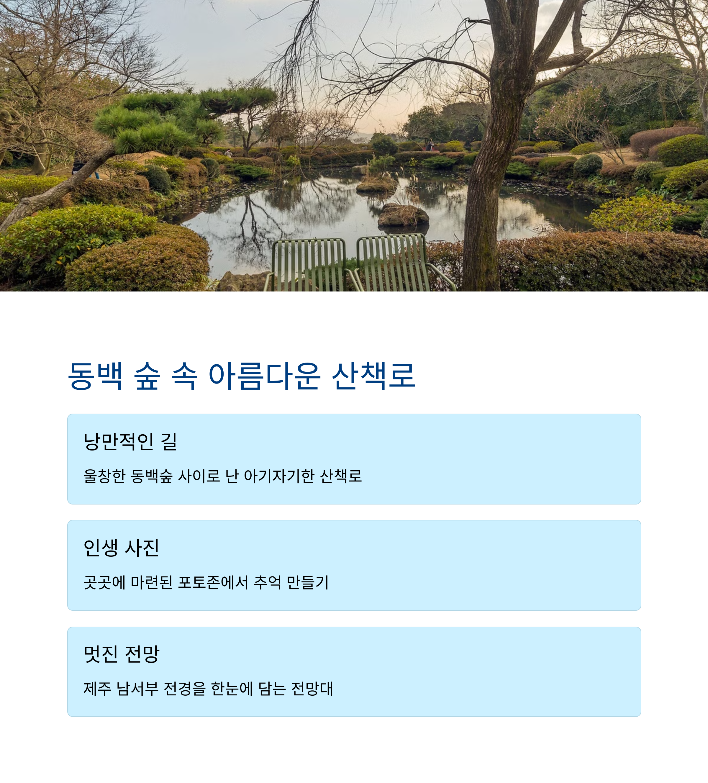 카멜리아힐의 매력은 단지 꽃에 그치지 않습니다. 정자 쉼터와 넓게 펼쳐진 산책로는 걷기만 해도 힐링이 되는 구조로 되어 있어, 자연 속에서 하루를 보내기 딱 좋은 공간입니다. 다양한 조경수와 동백이 어우러져 마치 자연 미술관을 걷는 듯한 느낌을 주며, 가족, 연인, 친구 누구와 함께 가더라도 모두가 만족할 수 있는 장소입니다. 무엇보다 혼잡하지 않고 여유로운 분위기 덕분에, 자연을 오롯이 느낄 수 있어 더욱 특별합니다.