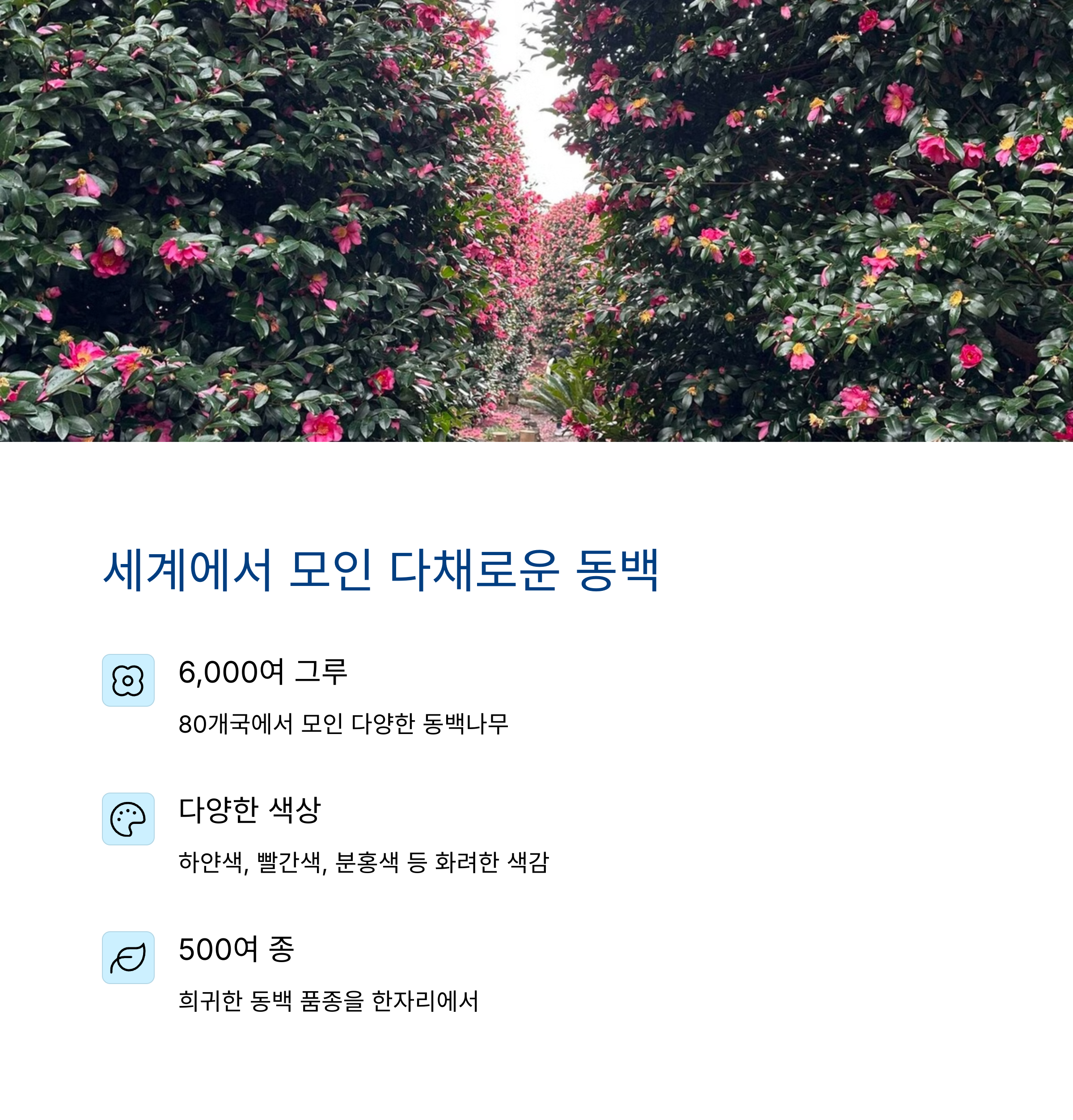 80개국 동백나무 전시 다양한 품종과 색상의 꽃 감상 연인, 가족 여행지로 추천