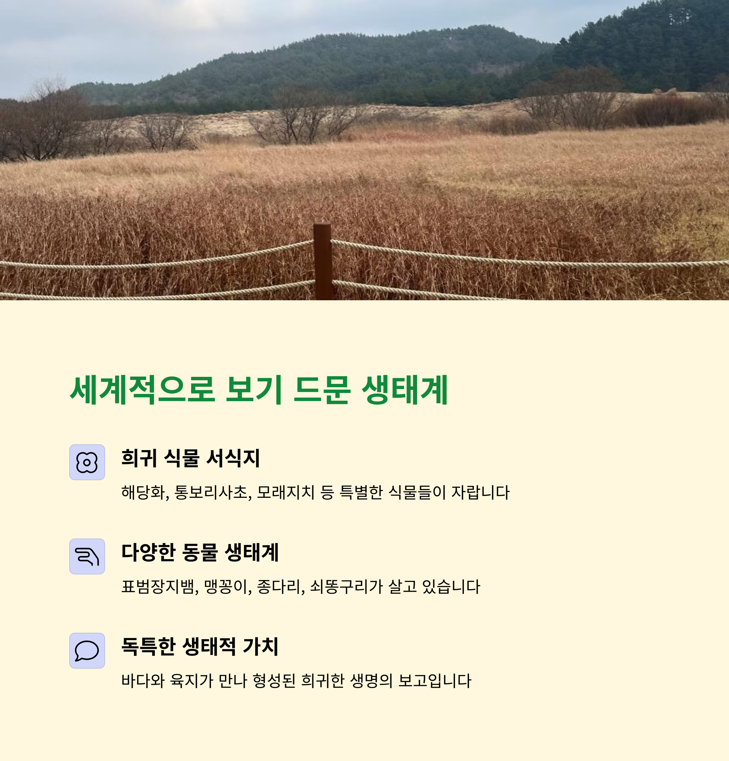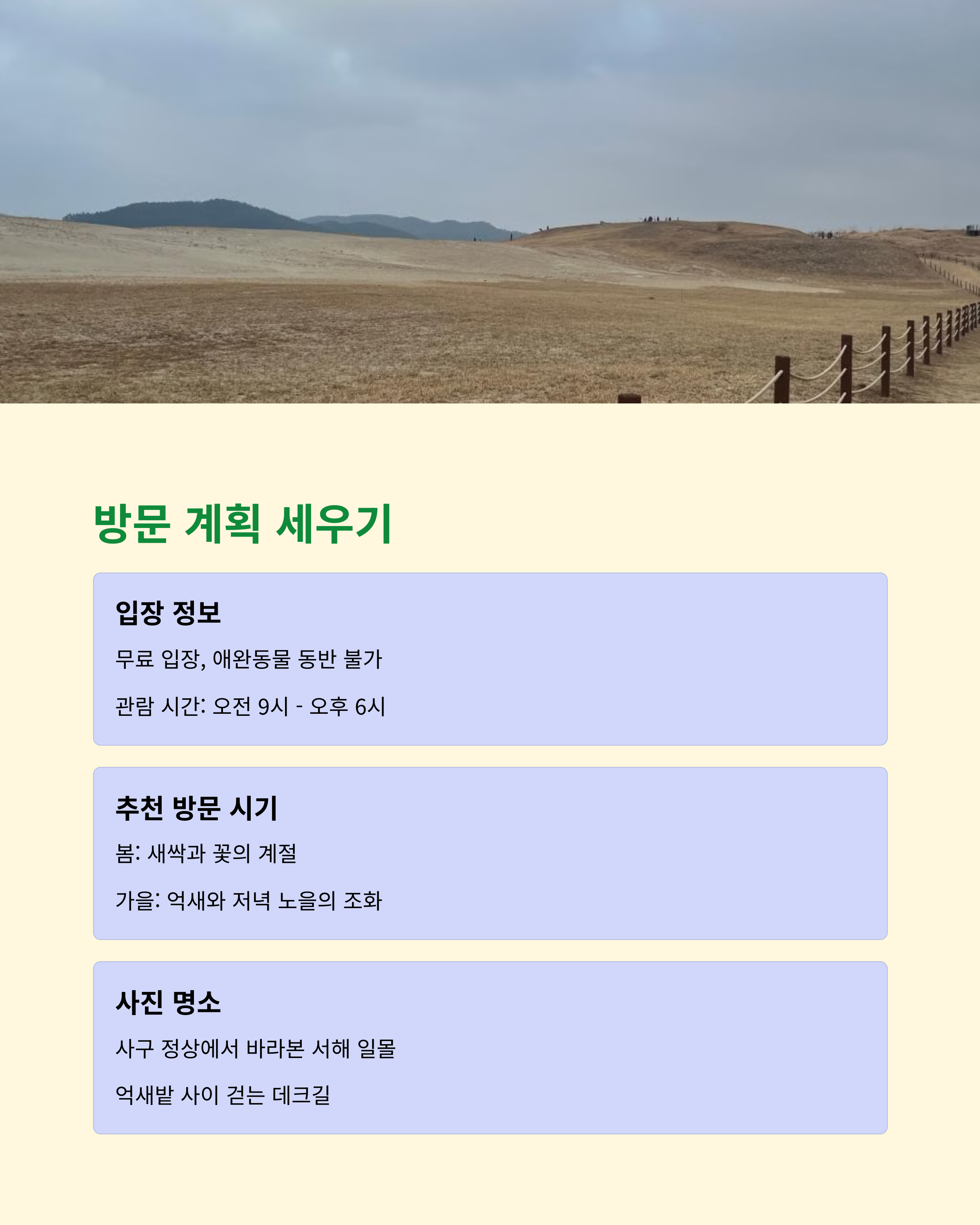| 해당화, 통보리사초 등 희귀 식물과 다양한 동물들이 공존합니다. | 여름엔 초록, 겨울엔 사막처럼 바뀌는 다채로운 자연 풍경. | 곰솔 숲 산책, 억새골 탐방, 생태관 관람이 가능합니다. |