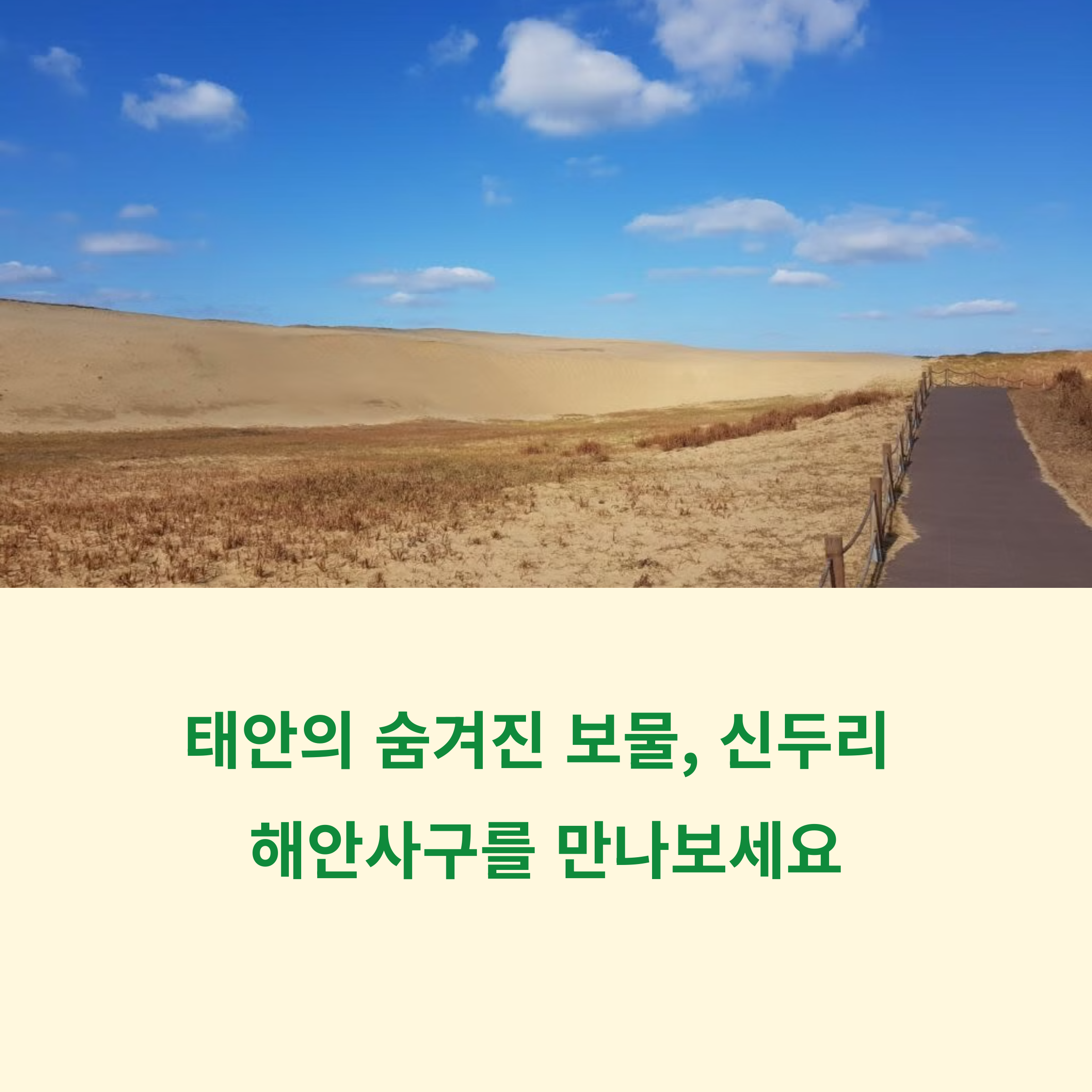 우리나라에도 사막 같은 풍경이 존재한다는 사실, 믿기시나요? 바로 태안 신두리 해안사구는 그 신비로운 자연의 모습을 가장 잘 보여주는 국내 최대의 해안사구입니다. 바다와 바람이 오랜 시간 만들어낸 모래 언덕은 계절마다 그 얼굴을 바꾸며, 방문객에게 마치 다른 세계에 온 듯한 특별한 인상을 남깁니다. 2001년 천연기념물로 지정된 이곳은 단순한 관광지를 넘어, 다양한 생물이 어우러진 생태 교육의 장이기도 합니다. 모래 위에 발을 딛는 순간부터 자연이 만들어낸 조각들을 눈으로 직접 보고, 바람의 숨결을 느끼며 살아 있는 지구의 시간을 경험하게 됩니다. 오늘은 태안 신두리 해안사구에서 느낄 수 있는 특별한 감동과 여유를 함께 전해드리겠습니다.
