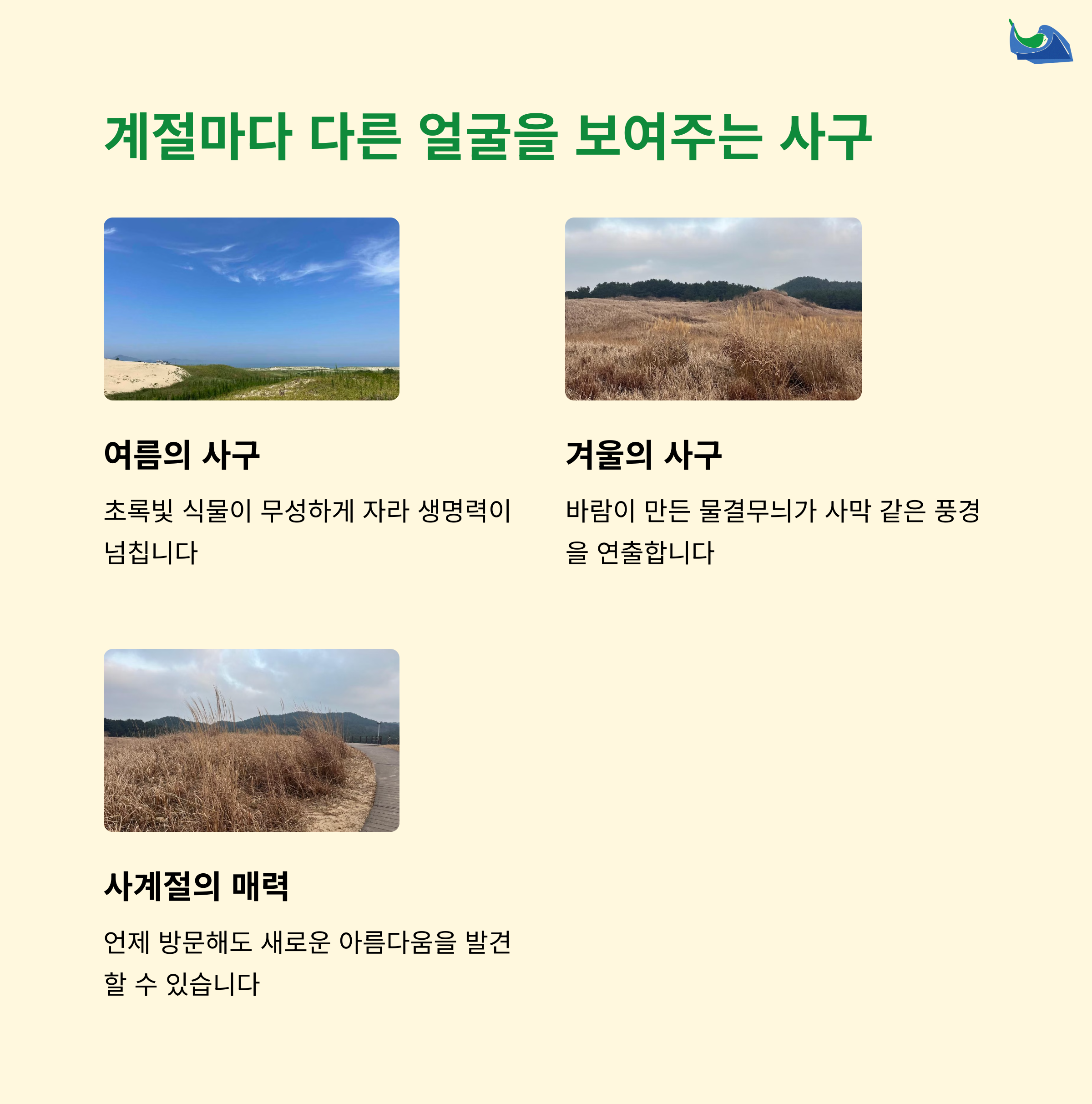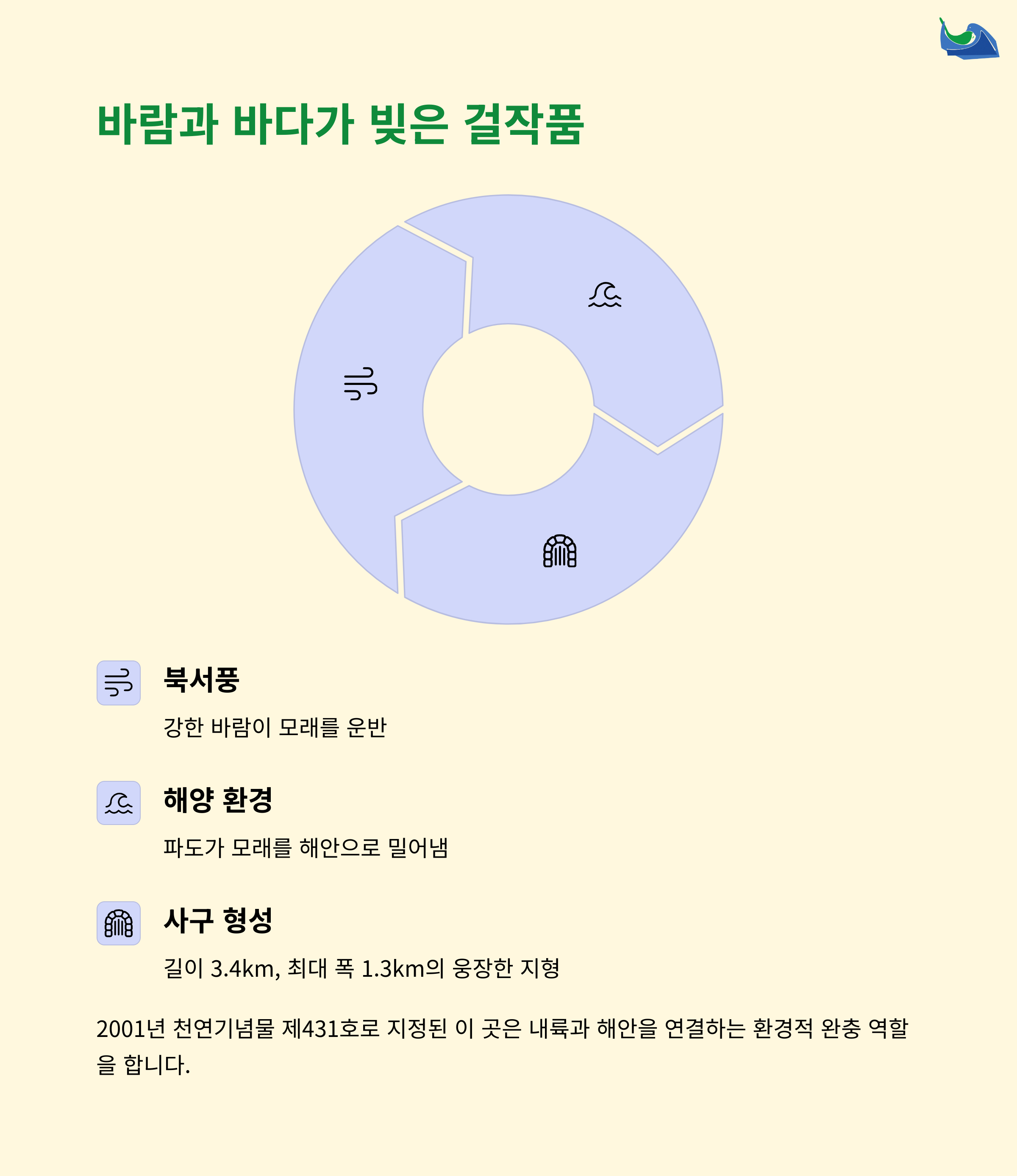 | 사구 규모 | 길이 약 3.4km, 너비 500m~1.3km에 달하는 국내 최대 사구입니다. |