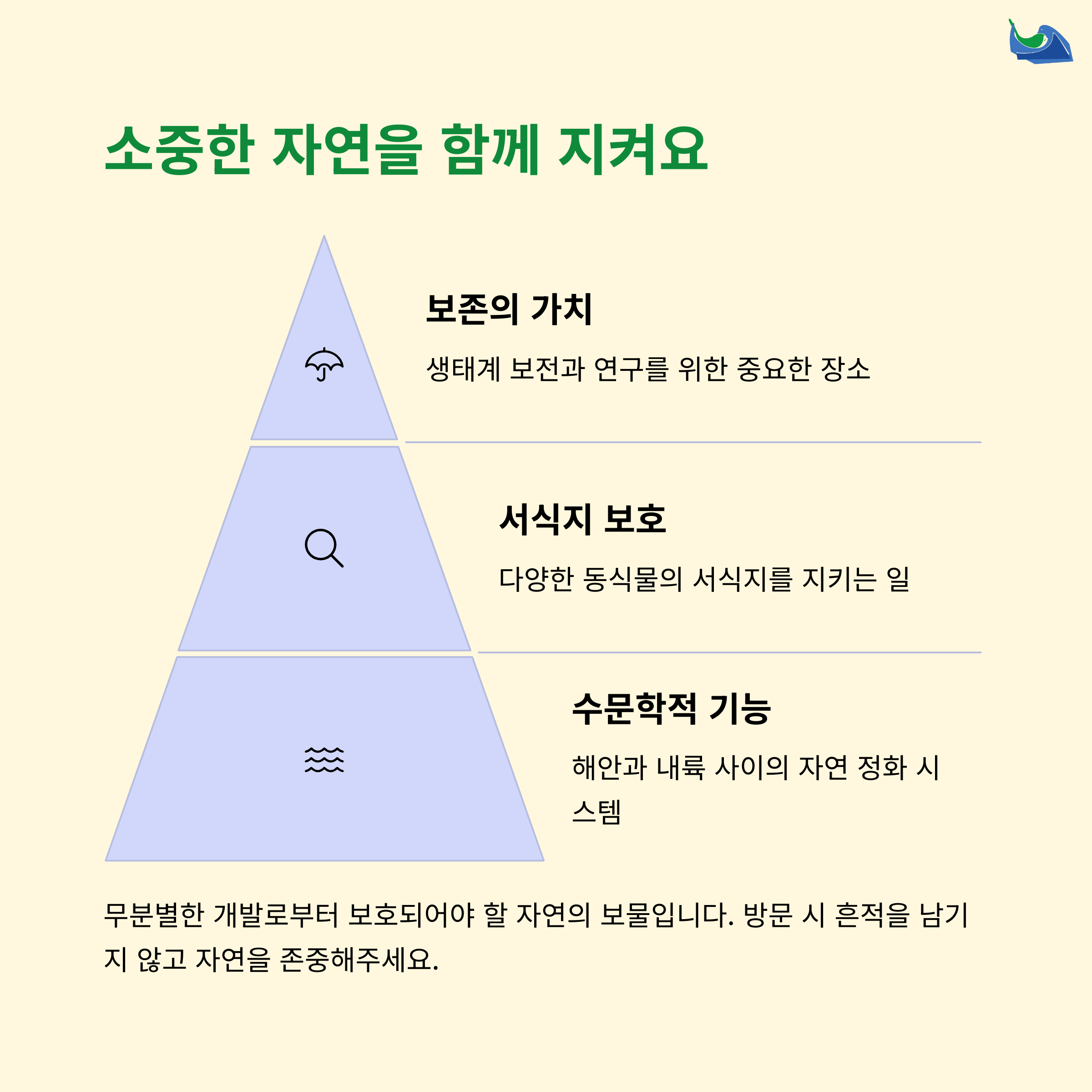 | 생물다양성 보호를 위한 교육과 보존활동도 진행됩니다. | 사진 애호가에게는 사계절 내내 인기 있는 촬영 명소입니다. | 방문자 센터에서 자연 해설 프로그램도 체험 가능합니다. |