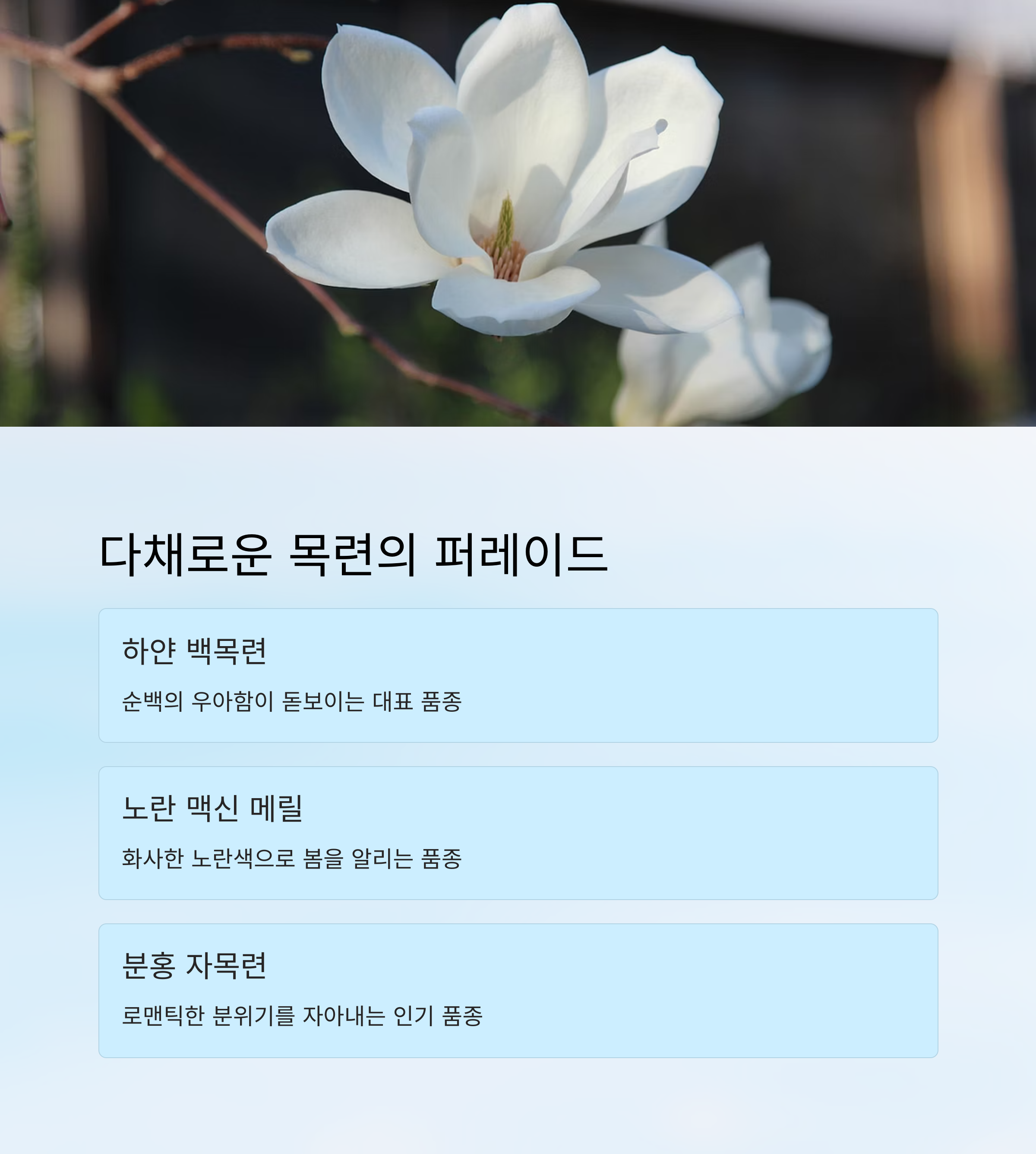목련 개화 시기 | 3월 말에서 4월 초까지 목련이 절정을 이룹니다. |