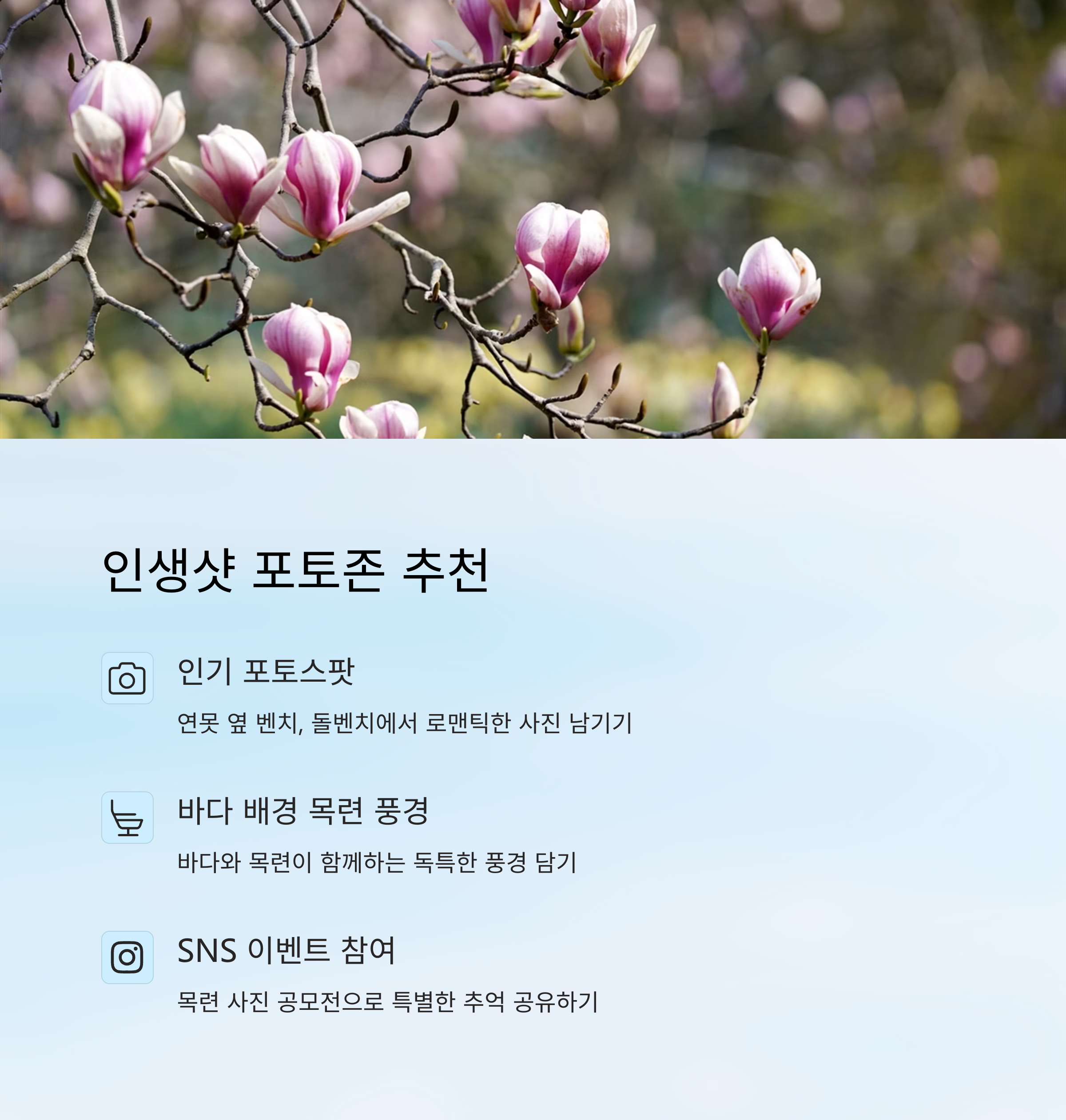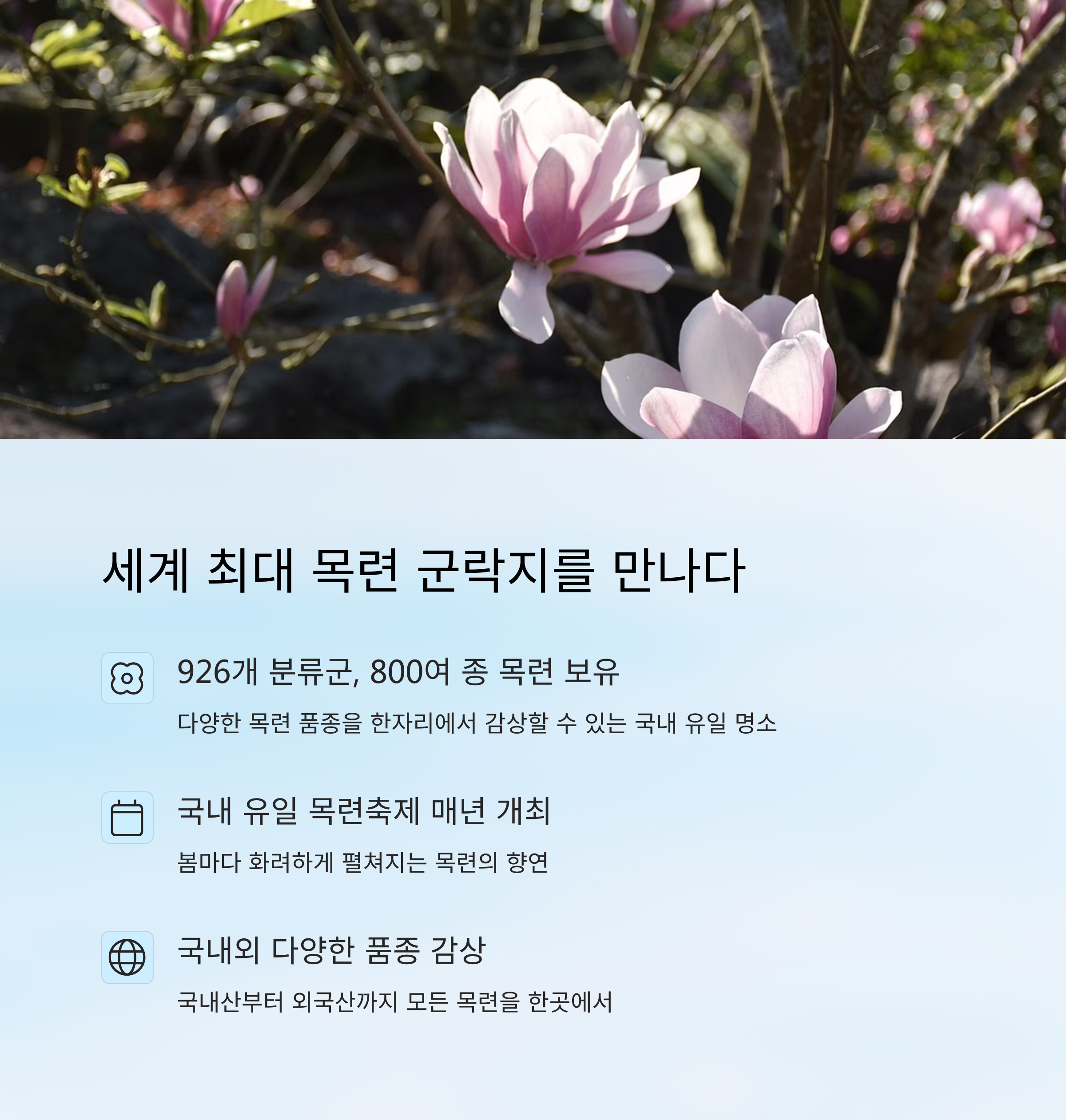 | 다양한 목련 품종이 모인 자연 생태 수목원 | 바다와 꽃이 어우러진 감성 산책로 | 가족, 연인 모두에게 추천하는 힐링 코스 |