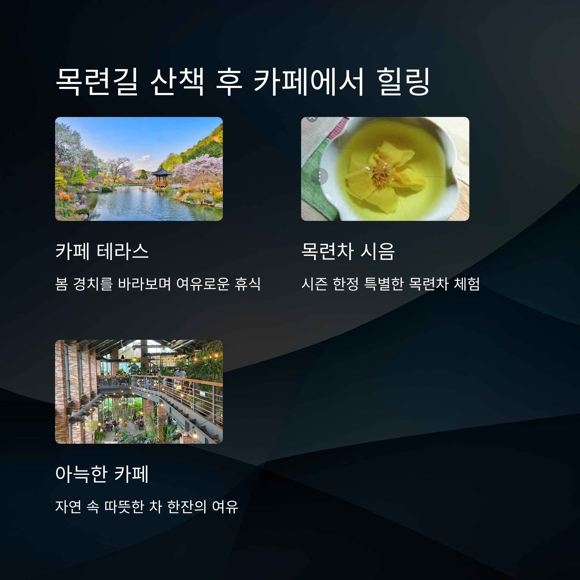 | 카페, 체험 프로그램 등 즐길 거리 풍성 | 포토존과 함께 인생샷 남기기 좋은 장소 | 조용하고 한적한 봄날의 여행지 |