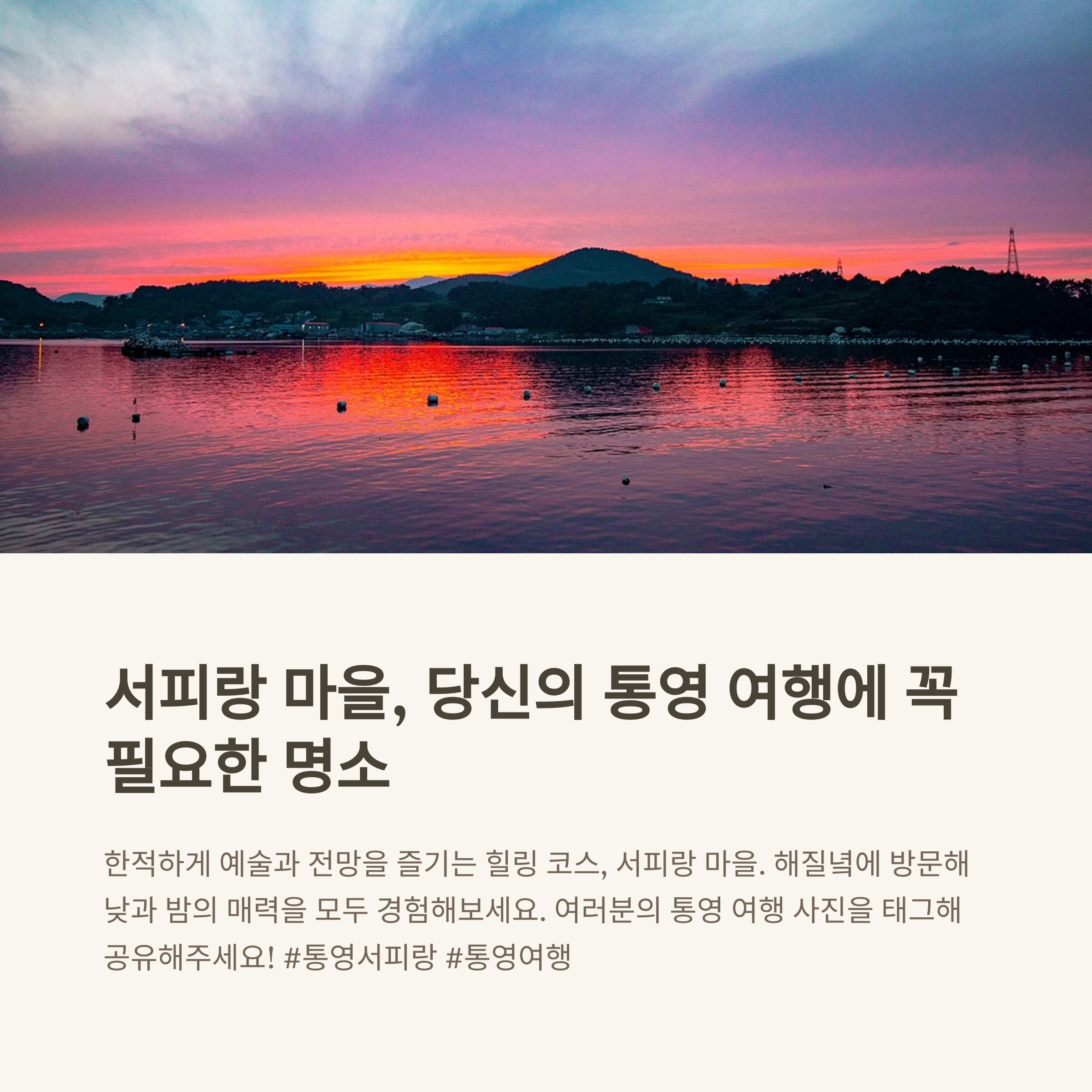 봄 벚꽃 시즌과 가을 단풍철에 특히 아름다우며, 해질녘~야경 시간대에는 서포루 전망대에서 로맨틱한 노을과 통영야경을 감상할 수 있어 인기입니다.