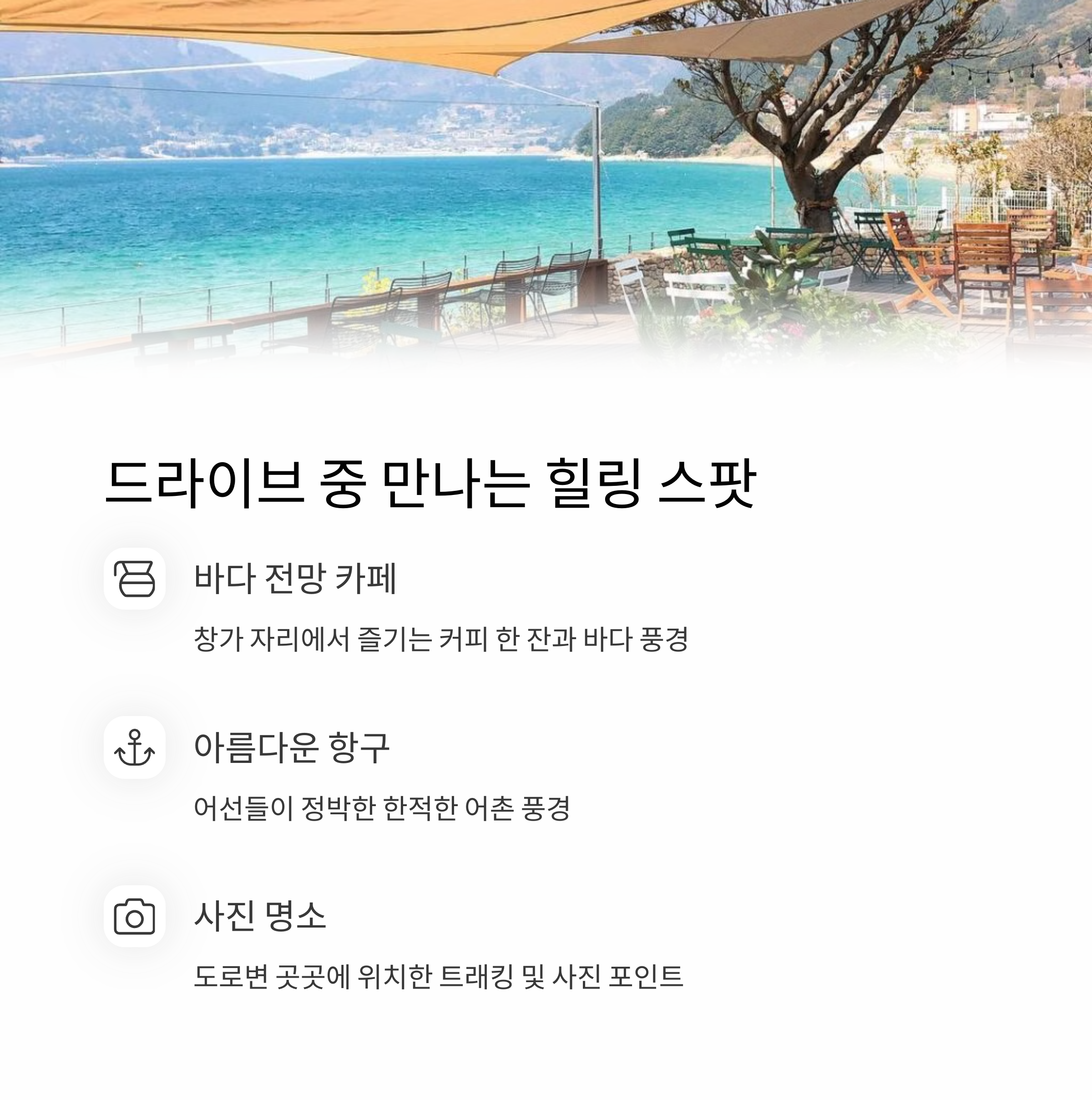 통영은 남해안의 진주라 불릴 만큼 아름다운 해안 경관과 예술적 감성이 풍부한 도시입니다. 그중에서도 달아공원은 일몰 시간에 맞춰 찾아가기 좋은 최고의 뷰 포인트로 손꼽히며, 드라이브 명소로도 유명합니다. 통영 시내 중심에서 출발해 미륵도를 따라 이어지는 산양일주도로는 드넓은 바다와 섬들이 어우러지는 풍경을 따라 천천히 달릴 수 있어 감성 여행에 안성맞춤입니다. 길가에 위치한 뷰 좋은 카페나 작은 포구에서 잠시 쉬어가는 여유도 여행의 매력을 더해줍니다.