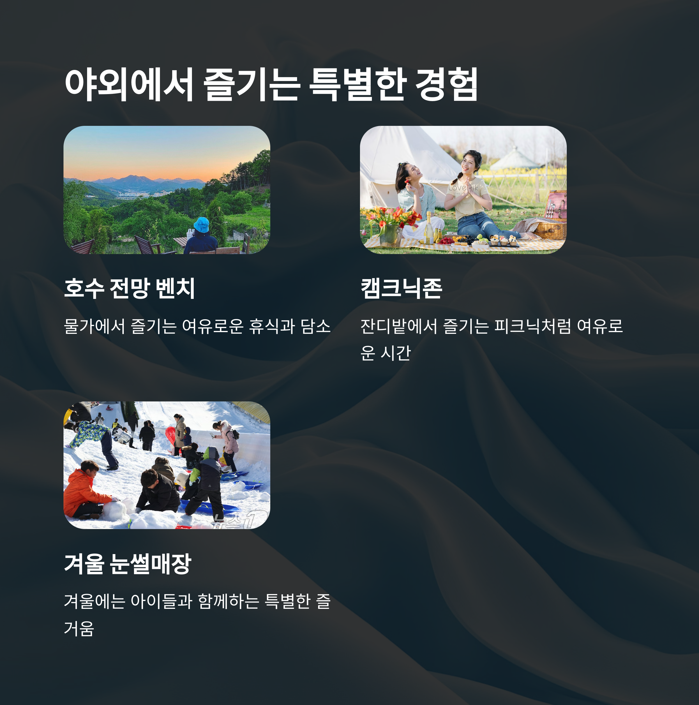 | 야외 즐길거리 | 캠크닉존, 호수 벤치, 겨울 눈썰매장 등 사계절 액티비티 |