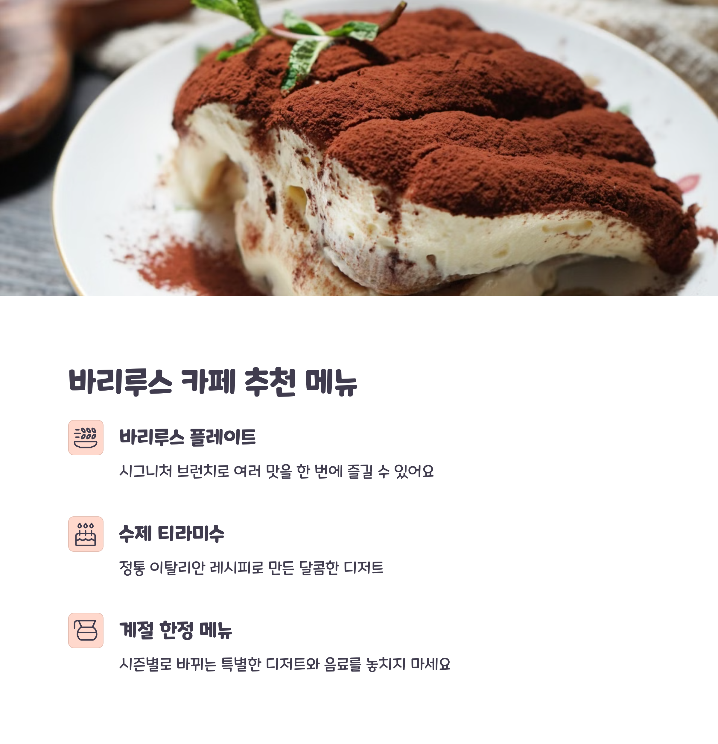 바리루스는 파주 프리미엄아울렛 인근의 초대형 이탈리아 감성 카페로 웅장한 외관과 유럽풍 인테리어, 조형물, 천장 높은 공간감이 돋보입니다. 고급스러운 분위기와 함께 브런치, 크루아상, 수제 케이크 등 디저트 퀄리티가 훌륭하며, 좌석 간 간격도 넓어 조용한 데이트에 적합합니다. 노을 시간대에는 유리창 밖으로 붉은 석양이 펼쳐져 인생샷을 찍기에도 제격입니다.