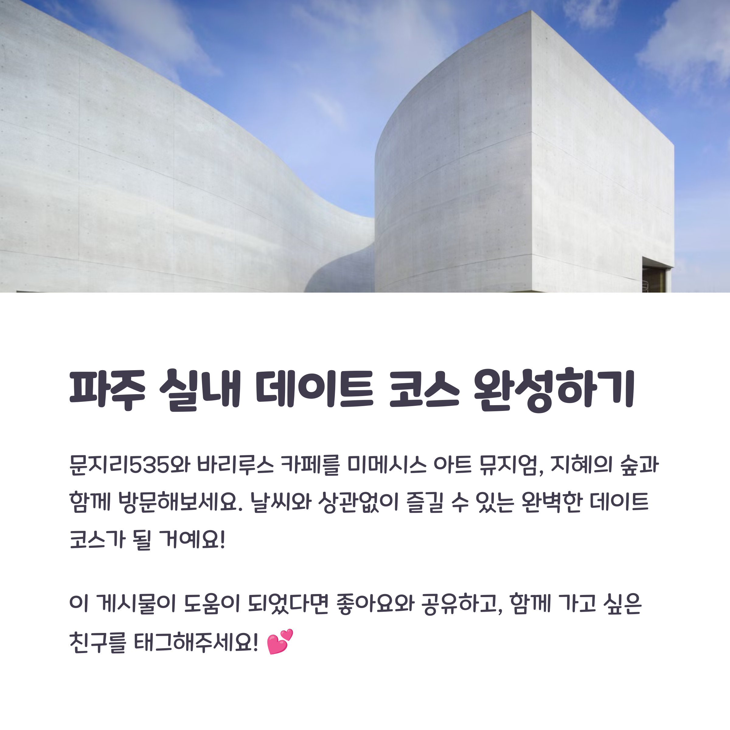 파주의 대형 실내 카페 문지리535와 바리루스는 감성적인 분위기와 맛있는 브런치, 넓은 공간 덕분에 날씨 상관 없이 여유로운 데이트를 즐기기 딱 좋은 장소입니다. 취향 따라 한 곳, 또는 두 곳 모두 들러보며 특별한 하루를 만들어보세요.