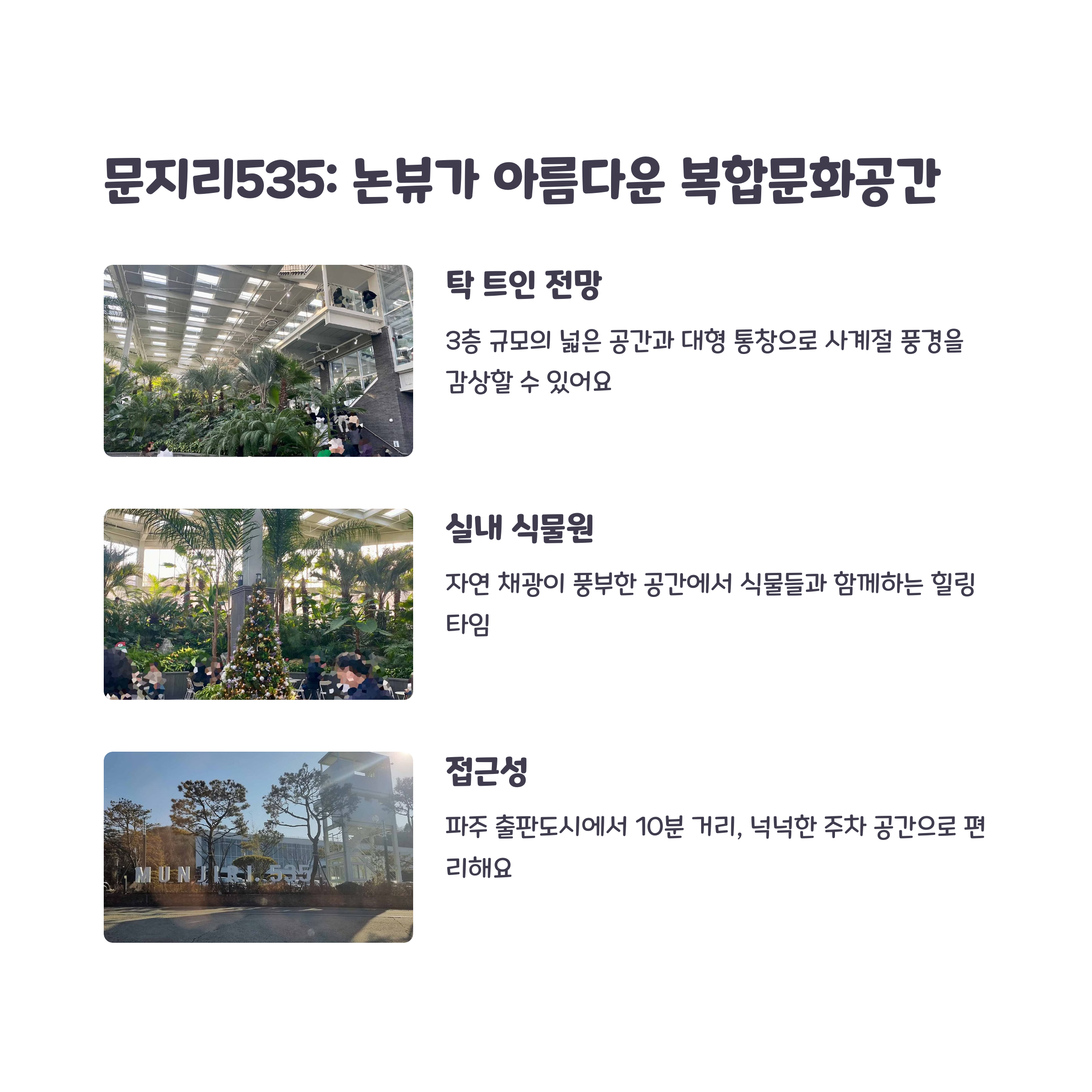 문지리535는 파주 문지리에 위치한 대형 실내 카페로 논뷰와 식물원 감성이 어우러진 고요하고 따뜻한 분위기를 자랑합니다. 1~3층까지 구성된 넓은 공간과 천장이 높은 통창은 탁 트인 시야를 제공하며, 곳곳에 그린 인테리어와 감성 포토존이 매력 포인트입니다. 브런치류와 디저트 종류가 다양하고 맛도 좋아 주말 데이트는 물론 조용한 평일 오후에도 여유롭게 즐기기 좋은 곳입니다.
