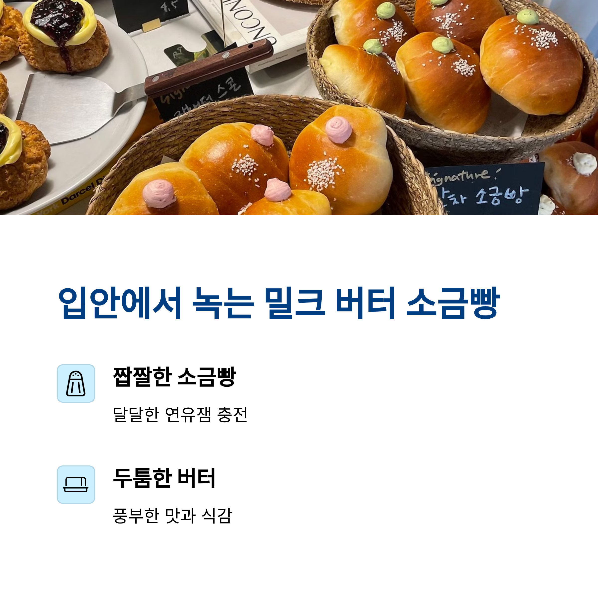추천 빵 중 가장 인기가 많은 밀크 버터 소금빵은 겉은 바삭하고 속은 촉촉한 식감이 매력적이며, 안에 연유잼과 두꺼운 버터가 더해져 달콤하고 고소한 맛의 조화를 이룹니다. 청양 명란바게트는 매콤한 청양고추와 명란의 풍미가 어우러져 자극적인 맛을 좋아하는 분들께 추천드립니다. 이 외에도 버터 스콘, 단팥빵, 마늘빵 등 하나같이 정성 가득한 맛이 인상적입니다.