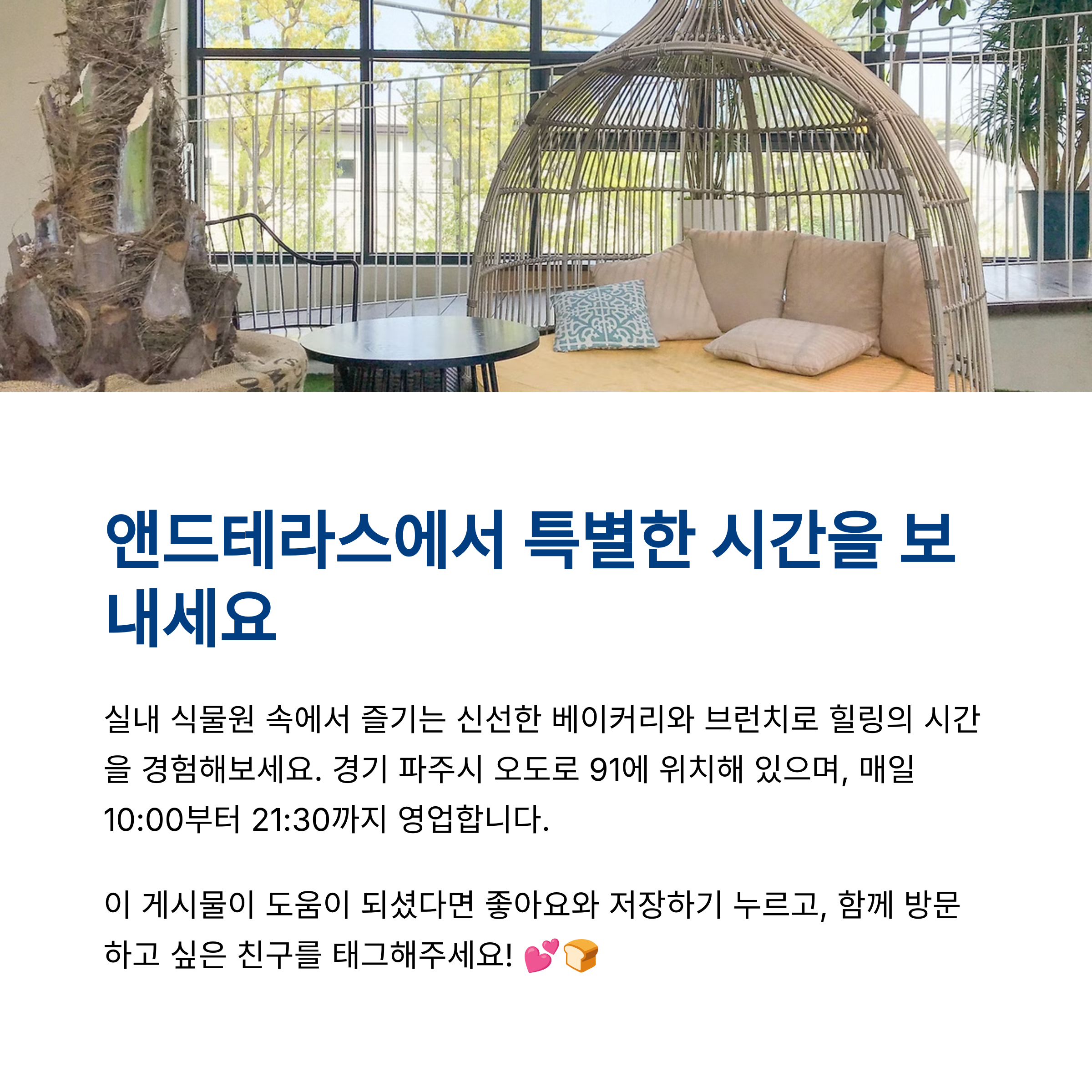 파주 앤드테라스는 자연 속에 있는 듯한 실내 인테리어와 넓은 공간 덕분에 힐링이 필요한 이들에게 제격인 장소입니다. 실내는 화분과 초록 식물로 가득 차 있으며, 창 너머 햇살이 들어오는 분위기가 참 따뜻합니다. 커피 한 잔과 함께 즐기는 빵과 브런치는 마치 해외의 고급 리조트에서 식사하는 듯한 여유로움을 느끼게 해줍니다. 특히 주말에는 대기 인원이 많을 만큼 인기가 높아 일찍 방문하는 것을 추천드립니다.