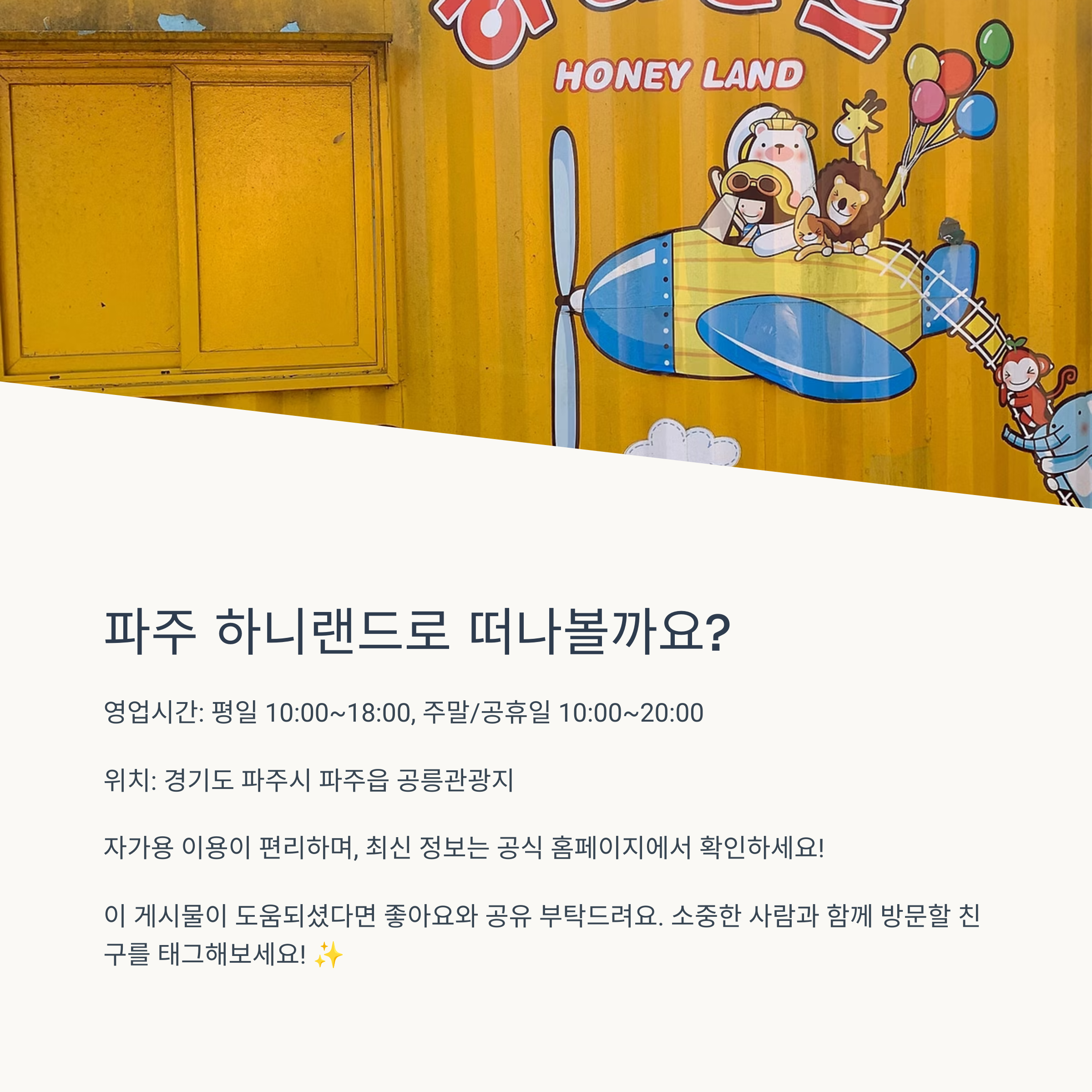 파주 하니랜드에 방문해본 경험이 있으신가요? 추천하고 싶은 놀이기구나 소풍 꿀팁이 있다면 댓글로 남겨주세요. 다른 가족들에게도 큰 도움이 될 수 있어요!