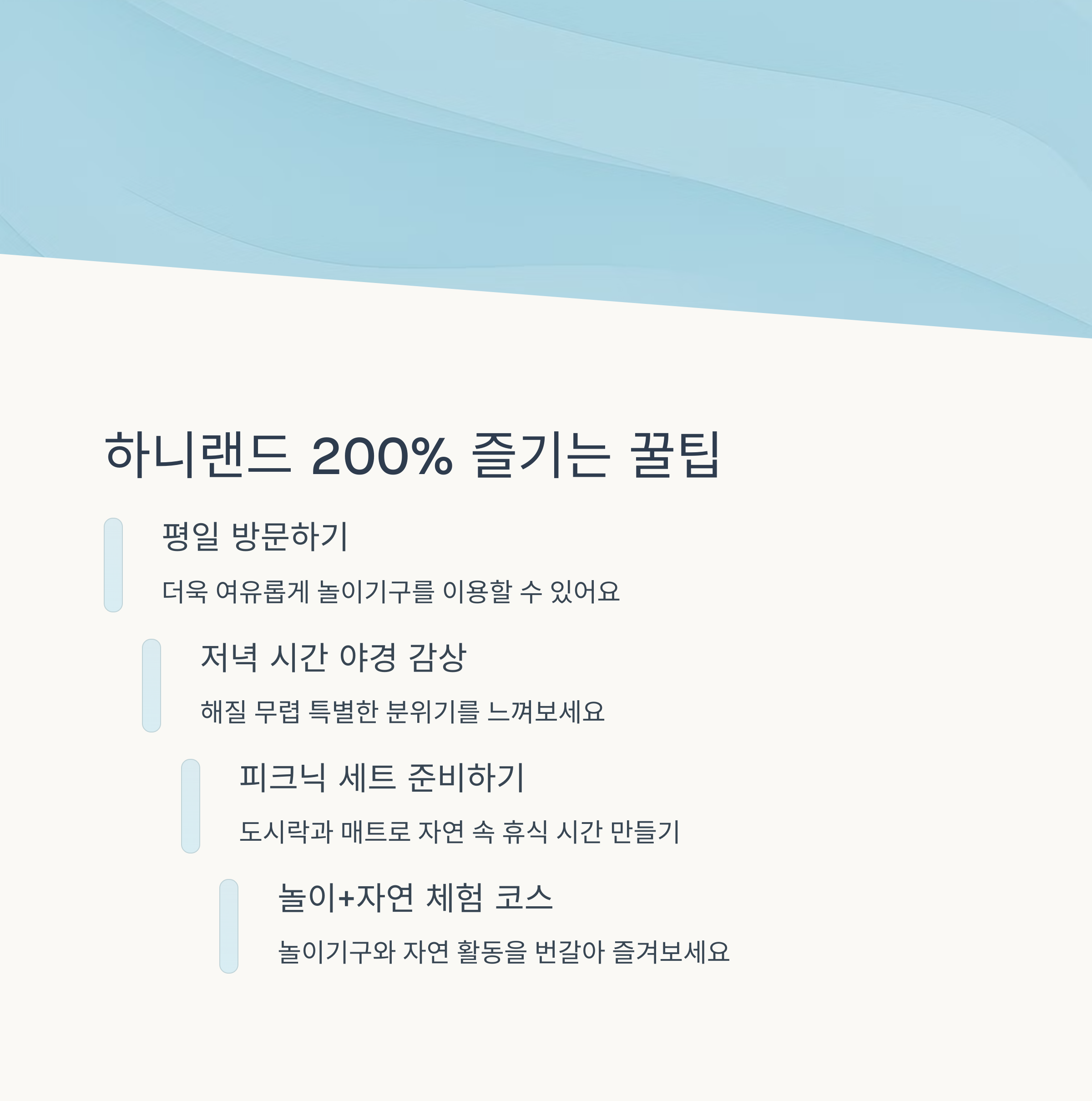놀이기구 외에도 하니랜드에는 넓은 잔디 피크닉장과 호수 산책로가 있어 자연 속에서 휴식을 즐기기에 안성맞춤입니다. 간단한 도시락을 챙겨와 가족끼리 돗자리를 펴고 소풍을 즐기거나, 호숫가를 따라 걷다 보면 오리배 체험도 할 수 있어 하루 종일 다채로운 즐거움을 누릴 수 있습니다. 계절마다 바뀌는 풍경과 여유로운 분위기 덕분에 방문하는 사람마다 힐링 여행지로 만족감을 느끼게 됩니다.