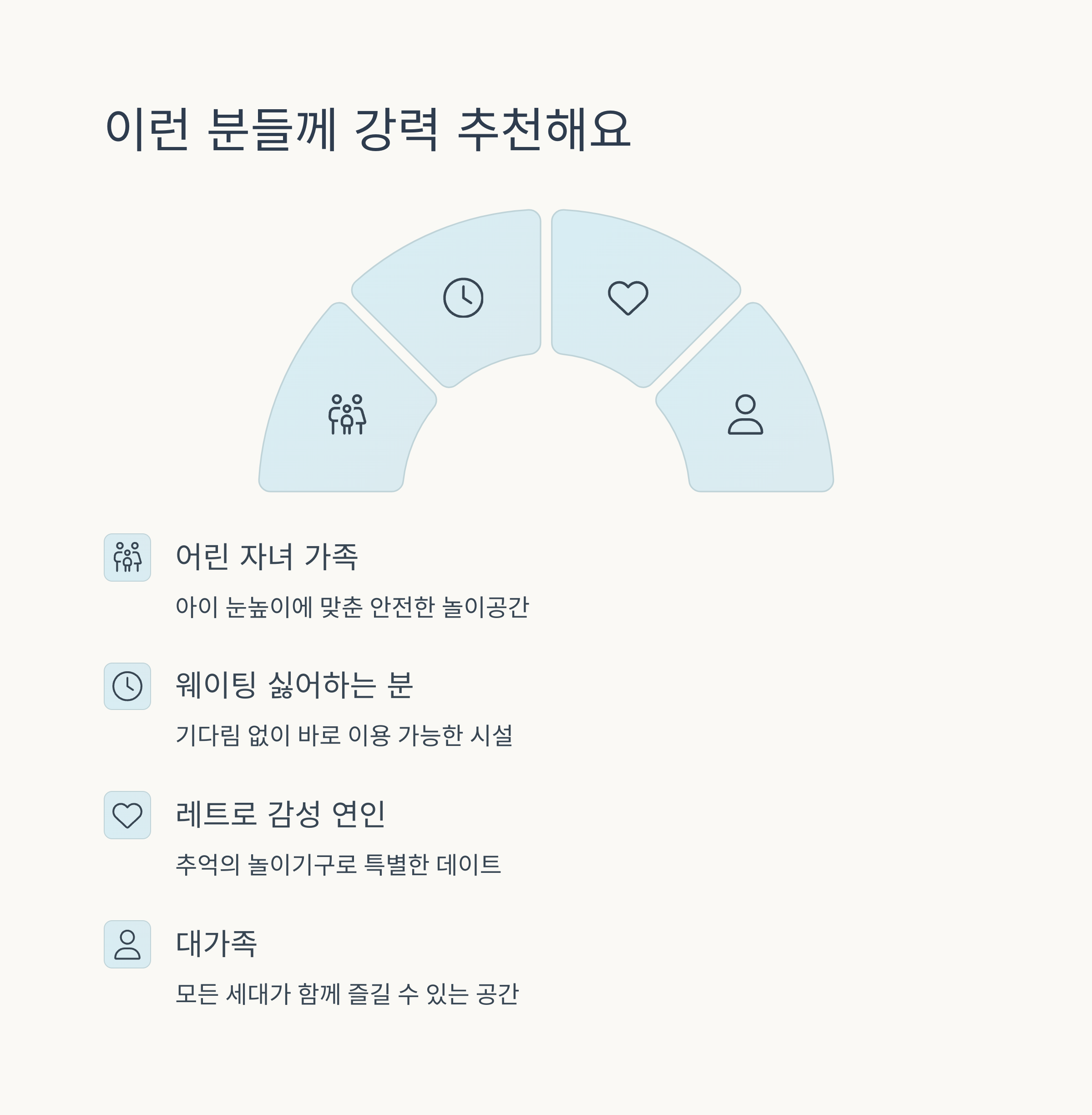 | 대가족이나 유아 동반 가족에게 추천 | 웨이팅 없이 여유롭게 놀이기구 즐김 | 조용한 분위기 속에서 가족과의 시간 |