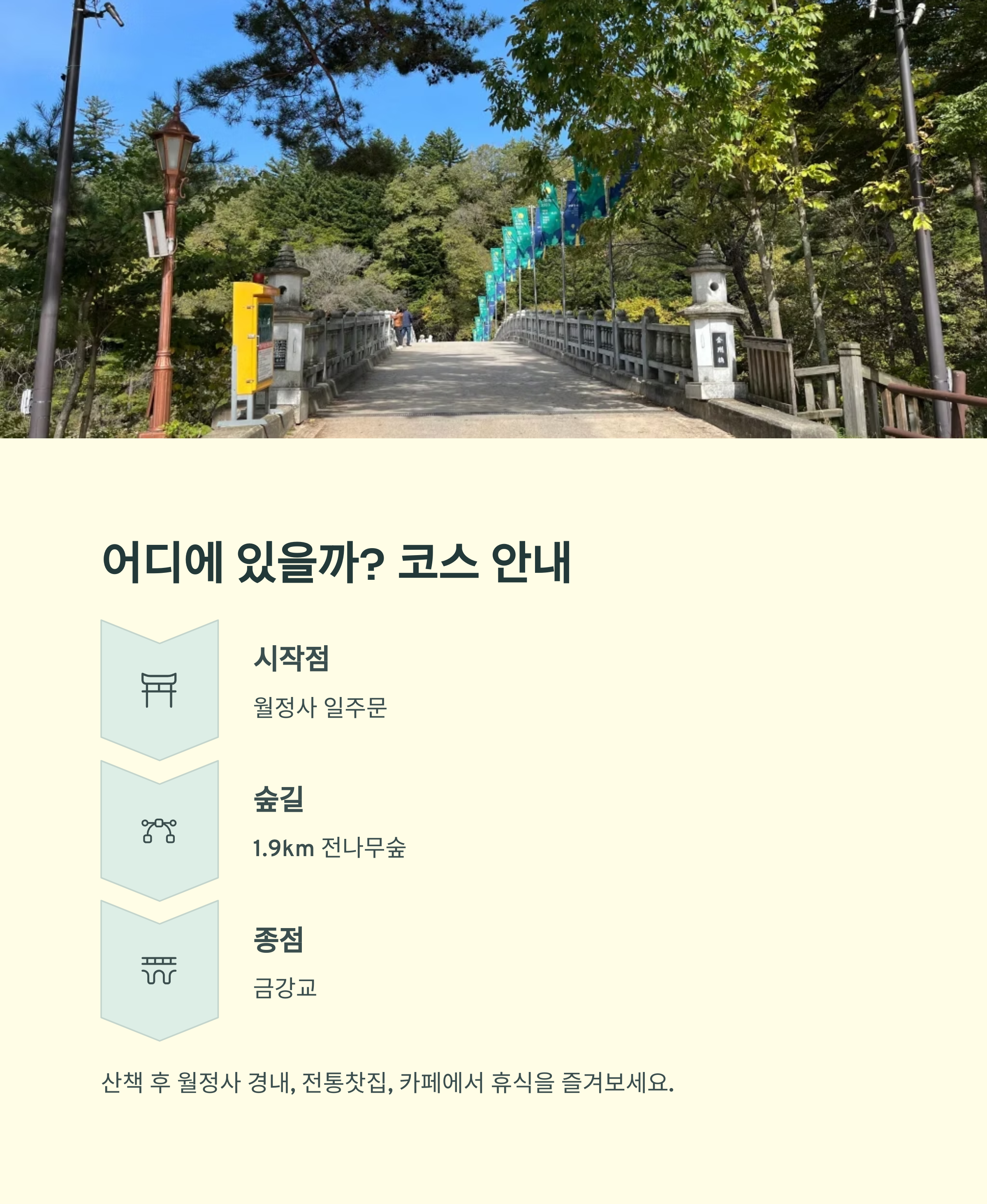 | 산책 정보 | 전나무숲길 1~1.9km / 평지 / 난이도 쉬움 / 일주문~금강교~월정사 |