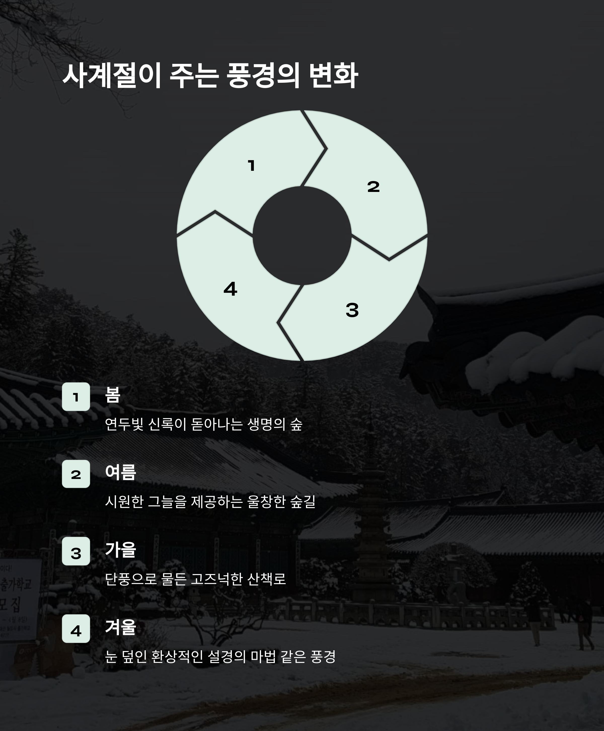 이 숲길은 드라마 <도깨비>의 명장면 촬영지로 알려지며 더욱 유명해졌으며, 사계절 모두 색다른 풍경을 선사합니다. 여름엔 시원한 그늘, 가을엔 낙엽 융단, 겨울엔 눈 내린 고요한 풍경, 봄엔 신록이 물든 숲으로 변신해 언제 방문해도 만족도가 높습니다.