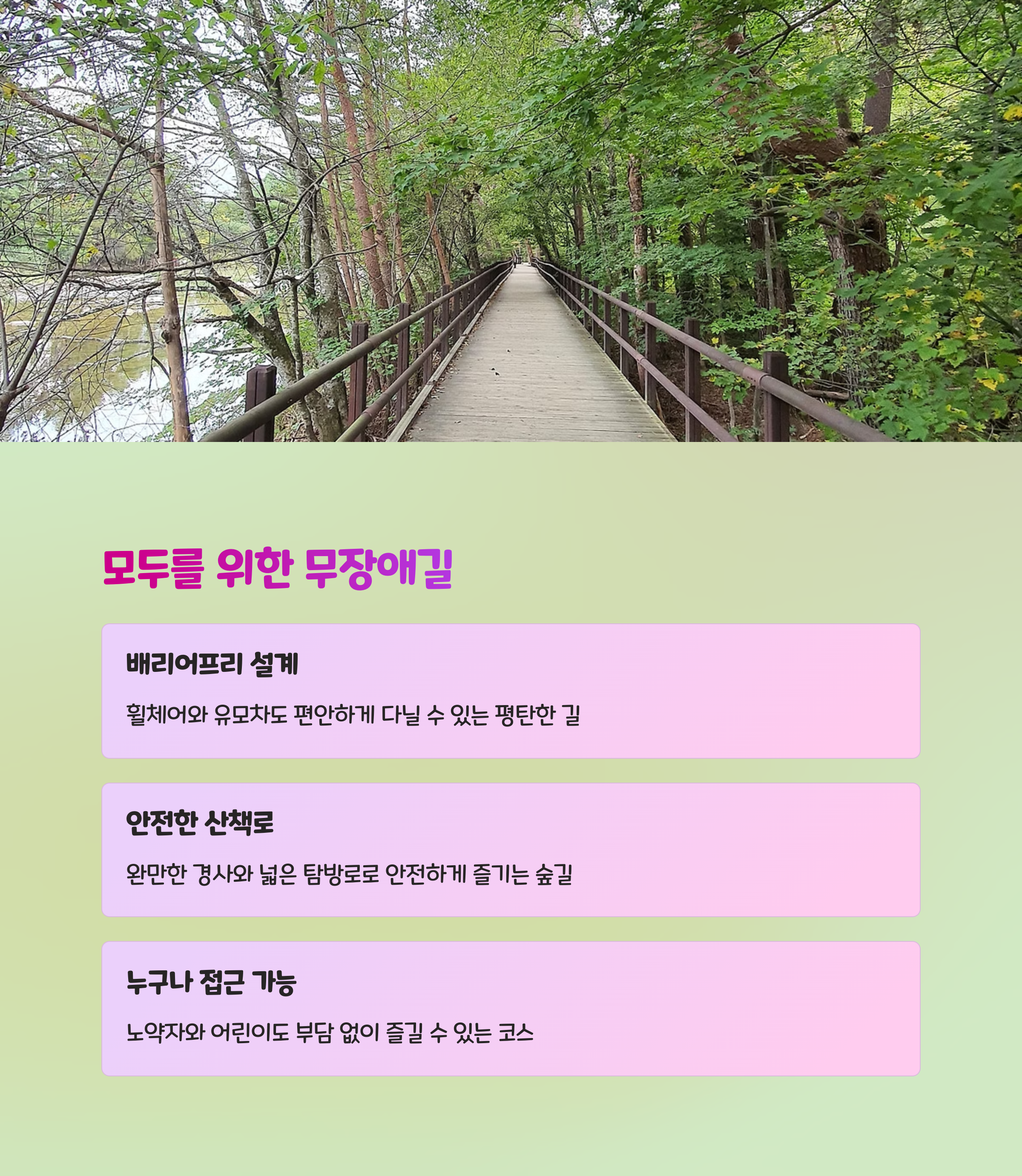 | 추천 이유 | 무장애길과 맨발 걷기 체험이 가능한 사계절 산책로 |