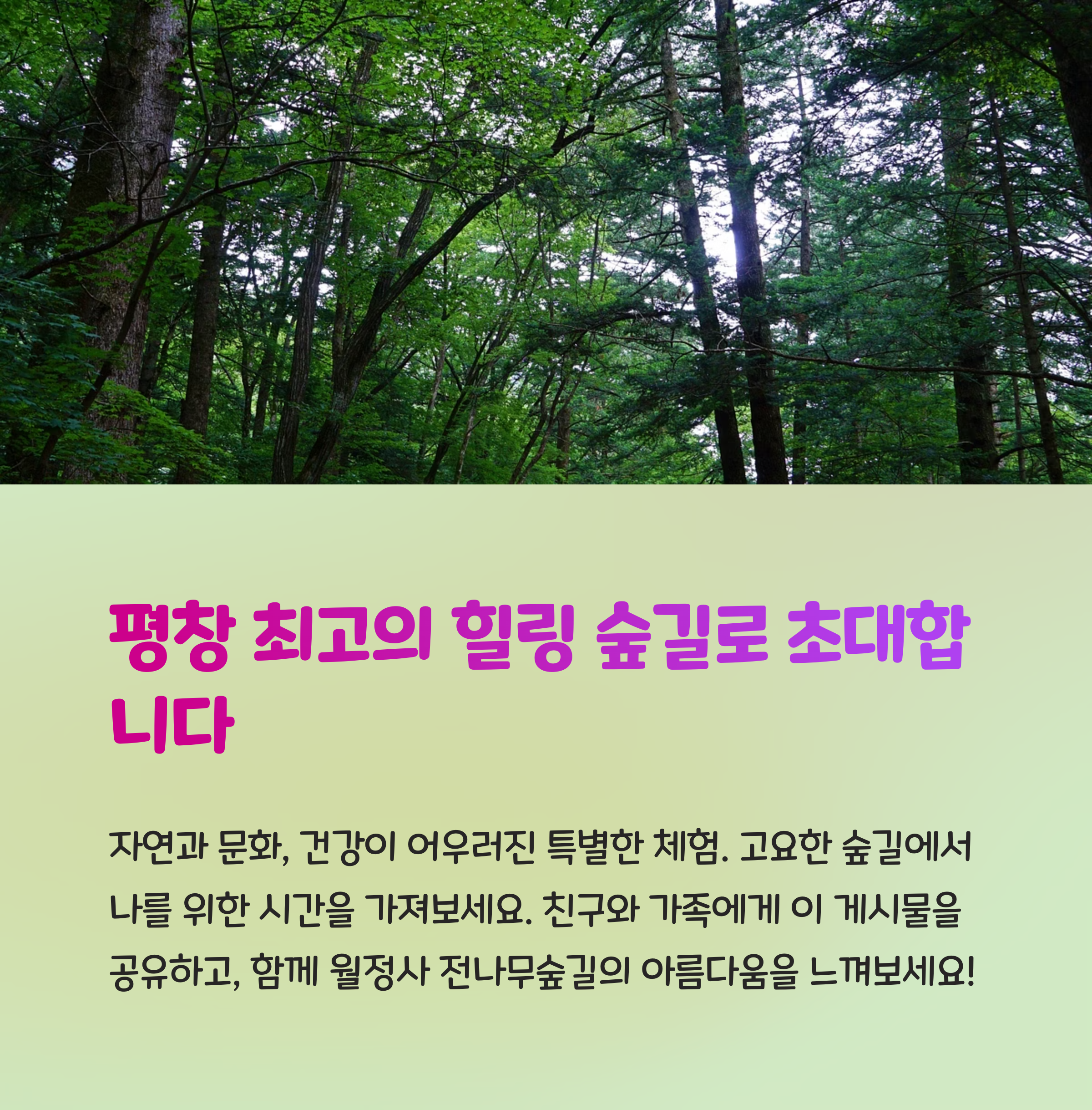 | 전나무숲길 특징 | 1km 숲길에 전나무 1,700여 그루가 조성된 힐링 명소 |