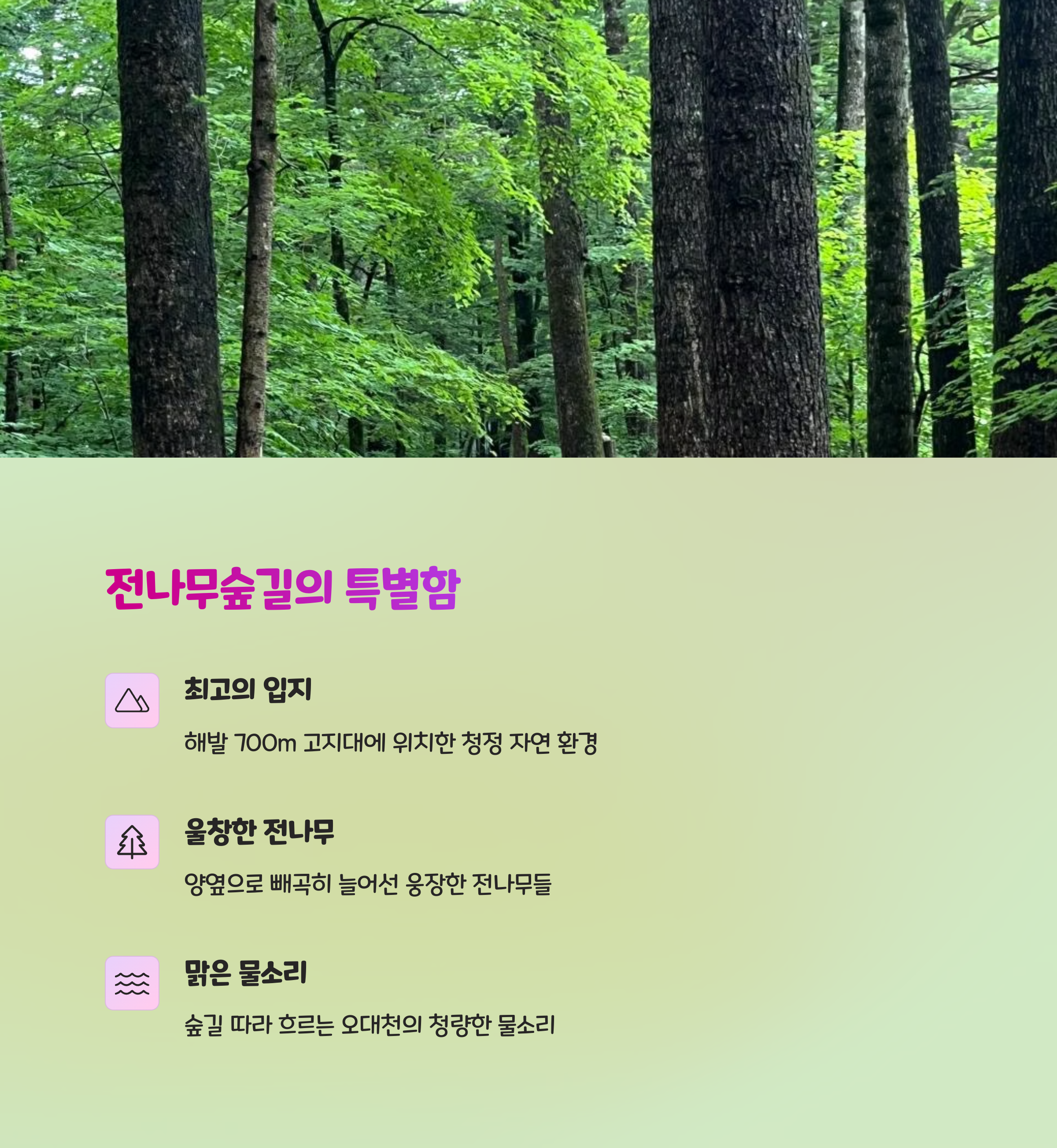 | 전나무숲길 특징 | 1km 숲길에 전나무 1,700여 그루가 조성된 힐링 명소 |