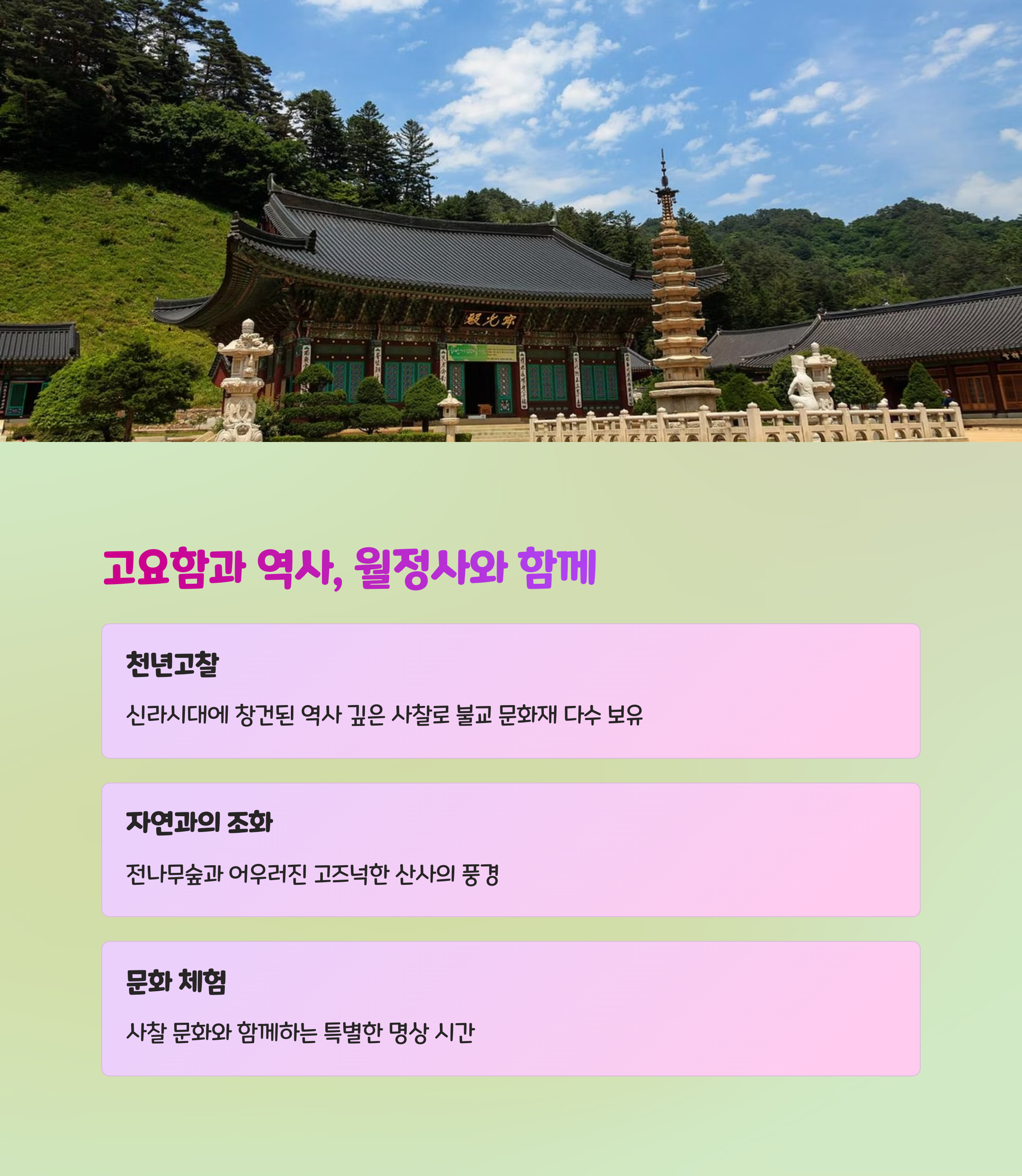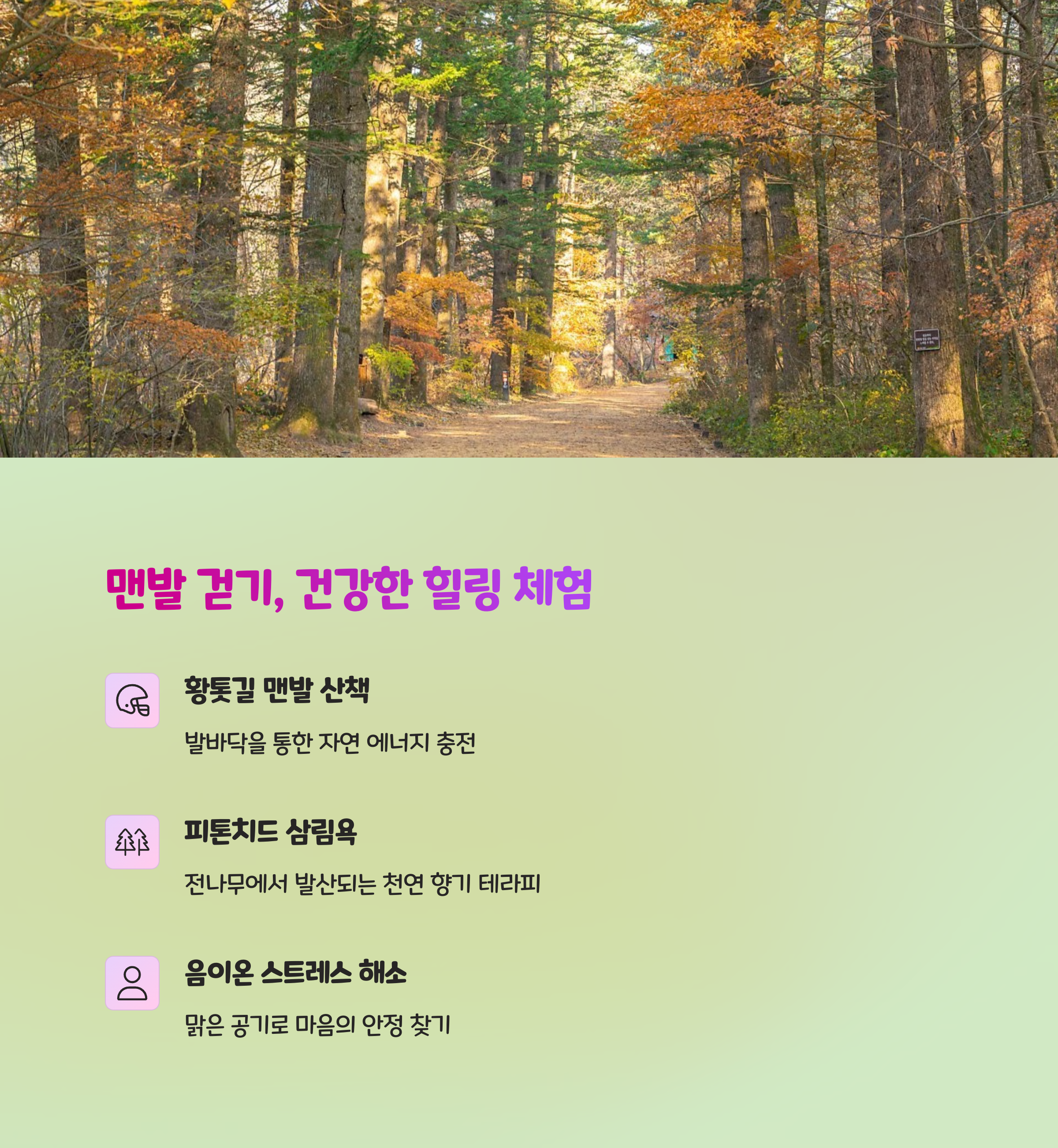 | 누구나 걷기 편한 흙길로 구성된 1km 숲길 | 건강한 에너지 충전 가능한 자연 치유 코스 | 천년 고찰과 설경이 어우러진 감성 여행지 |