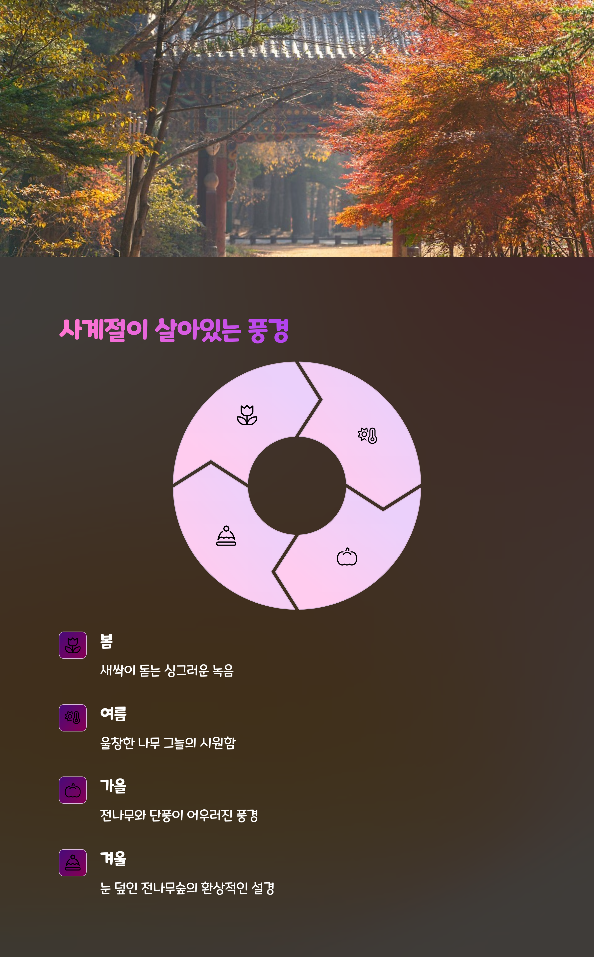 | 유모차, 휠체어도 편리하게 접근 가능 | 봄·가을에는 단풍, 겨울에는 눈길 트레킹 | 조용한 분위기와 아름다운 전통 건축물 |