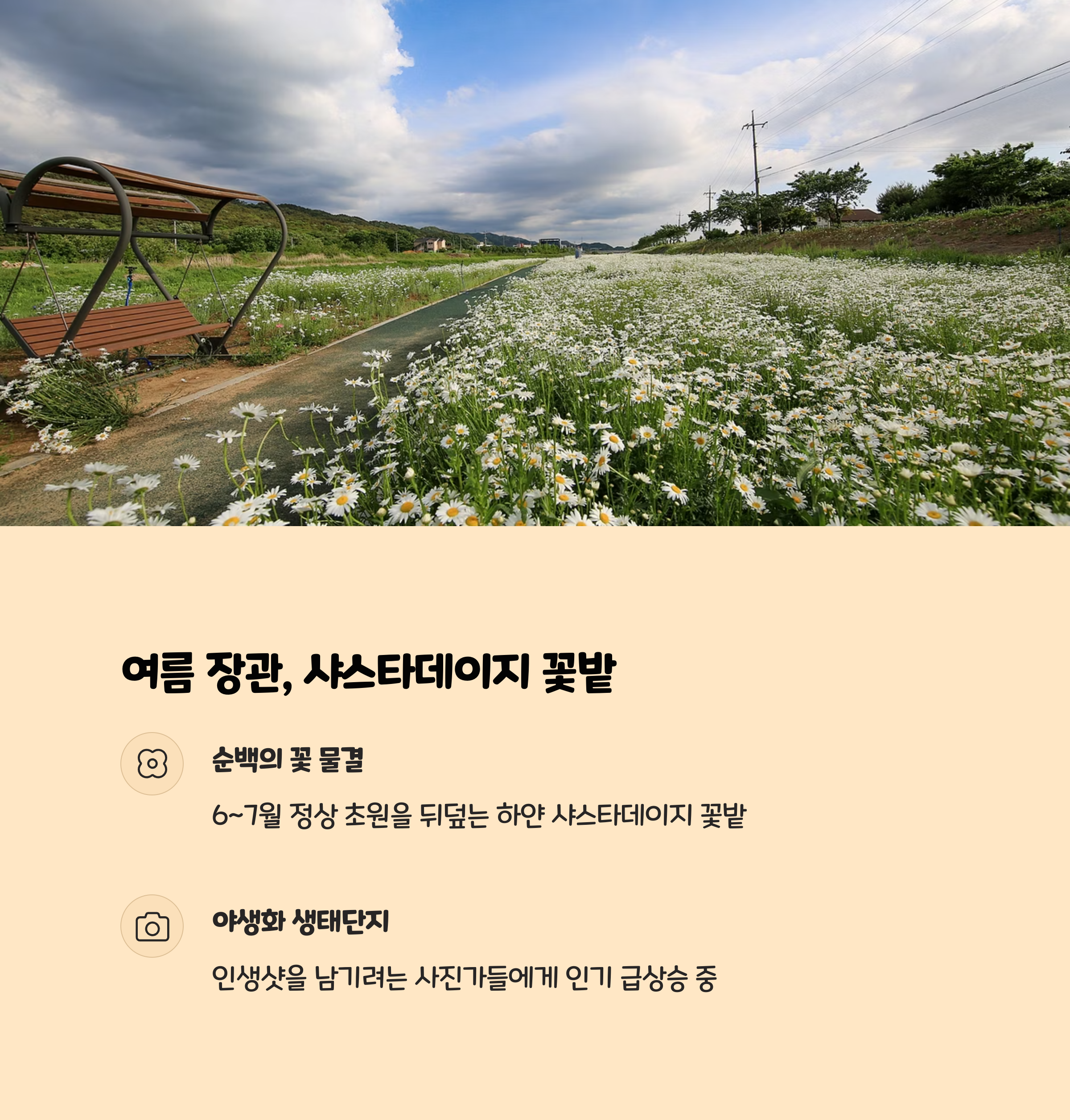 | 해발 1,200m 초원 풍경과 풍력발전기의 이색 뷰 포인트 | 샤스타데이지, 은하수, 포토존 등 사계절 사진 명소 | 깨비마을 캠핑장에서 글램핑, 카라반 체험 가능 |